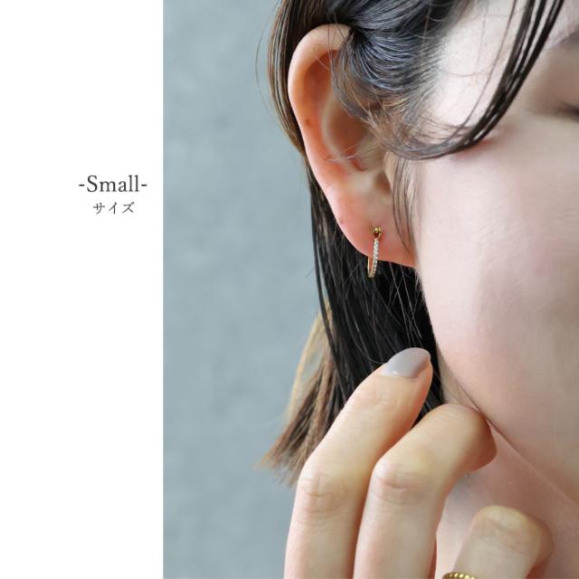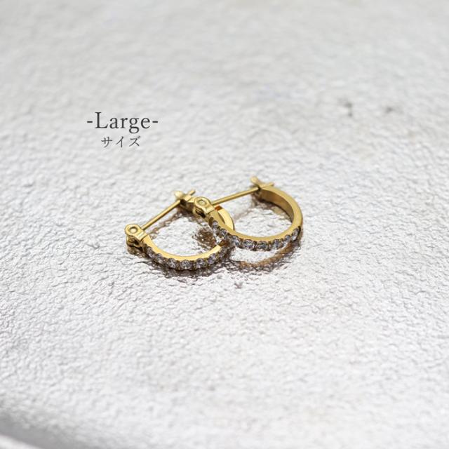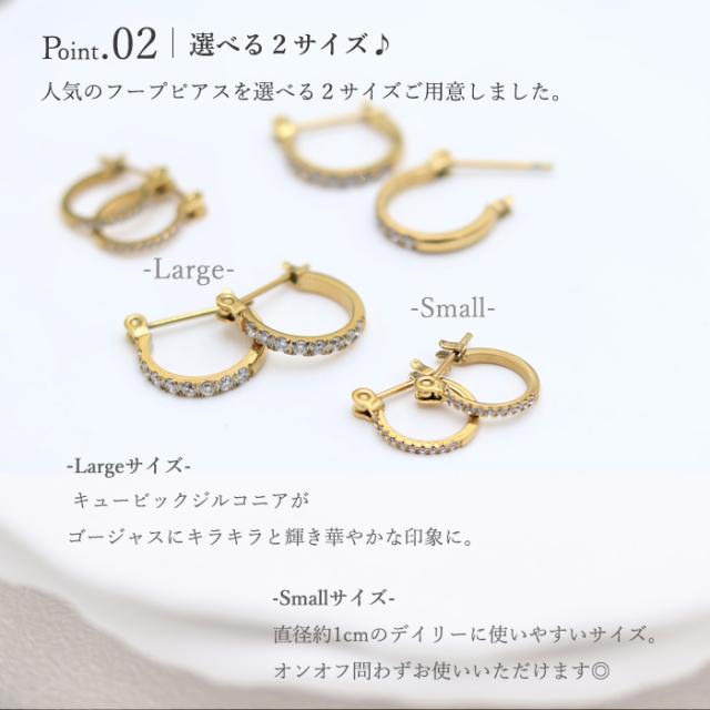 フープモチーフに、CZダイヤがキラキラ輝くピアス。 安心素材のサージカルステンレスだからつけっぱなしできるのもうれしい♪ さらにLarge、Smallで選べる2サイズ◎ 普段使いはもちろん、フォーマル、行事ごとにもおススメです。 |