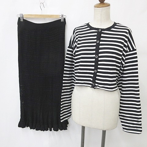 【中古】ナイスクラップ デイホリック カーディガン スカート 2枚セット 丸首 長袖 ボーダー ニット タイト ロング 黒 白 レディース