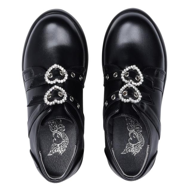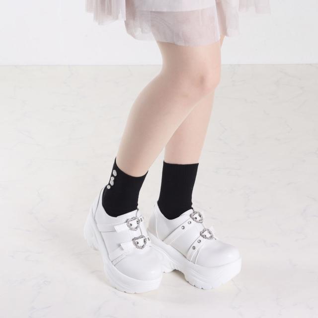 ダブルベルトにハートのバックルビジューがポイントの軽量厚底シューズ。