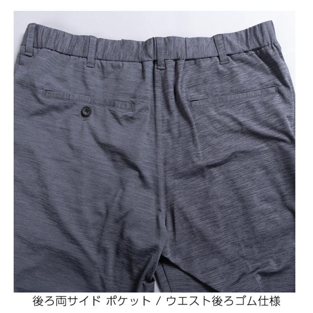パンツはウエストゴム仕様で快適。細身のテーパードシルエットと