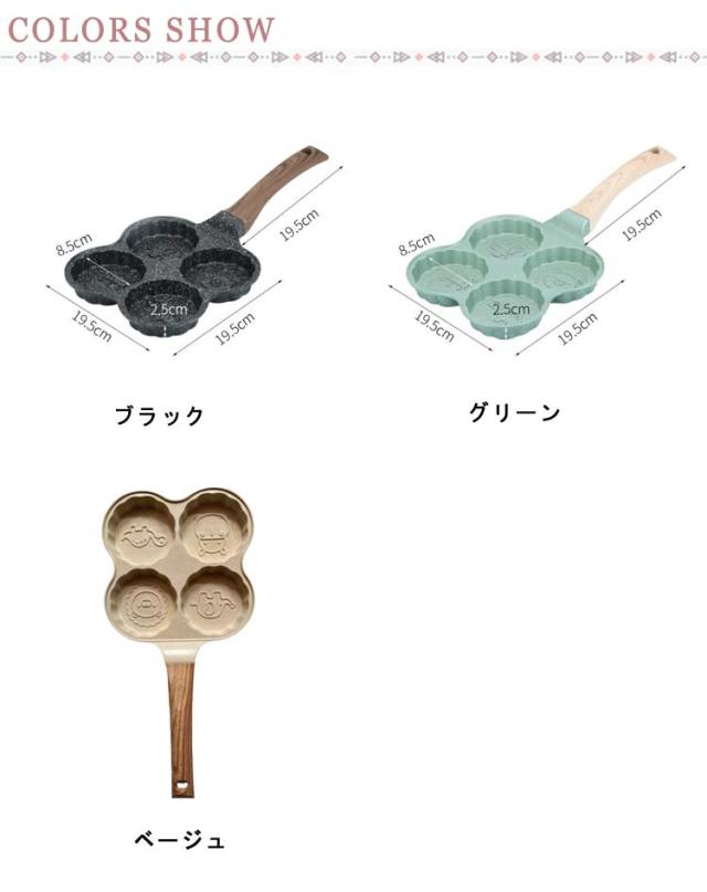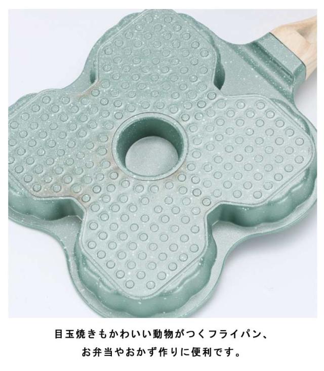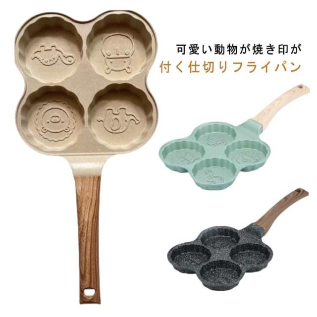 | 可愛い動物が焼き印が付く仕切りフライパン。 四つ穴設計で、一度に4個のポットケーキや4種類の食材が調理できるパンケーキパン。 目玉焼きもかわいい動物がつくフライパン、お弁当やおかず作りに便利です。 フッ素コーティングなのでこびりつきにくく、きれいに焼くことができます! IHや直火対応なので、熱源を選ばず、ご家庭でもアウトドアでもご使用いただけます。 | |