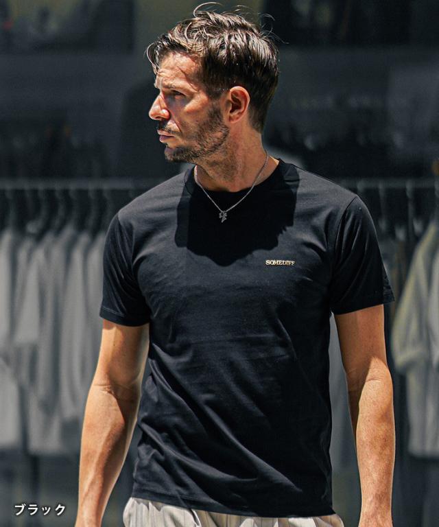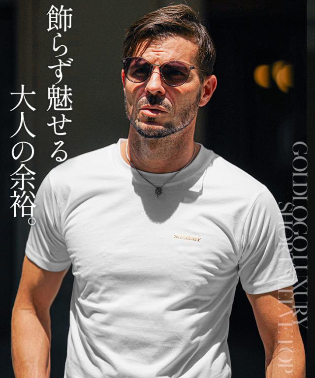 SOMEDIFF(サムディフ)『ゴールドロゴラグジュアリー半袖カットソー』【ゴールドロゴラグジュアリーカットソー】■Design/デザインSOMEDIFFから、一格上のオトナのためのゴールドロゴ半袖カットソーが新登場。程よく光沢感のある、薄手な生地感でシルクタッチの滑らかな肌触りを楽しめる。それだけでなく、美麗なシルエットに仕上げることで、纏うだけで品のあるTシャツスタイルに。ジャケットなどのインナーに最適なこのカットソーは、ゴールドのワンポイントロゴが施されることで、1枚でも品格が溢れる至極の逸品に。ハイブランドに負けない着心地を楽しめるのと、その汎用性の高さは自信を持ってお届けできる。