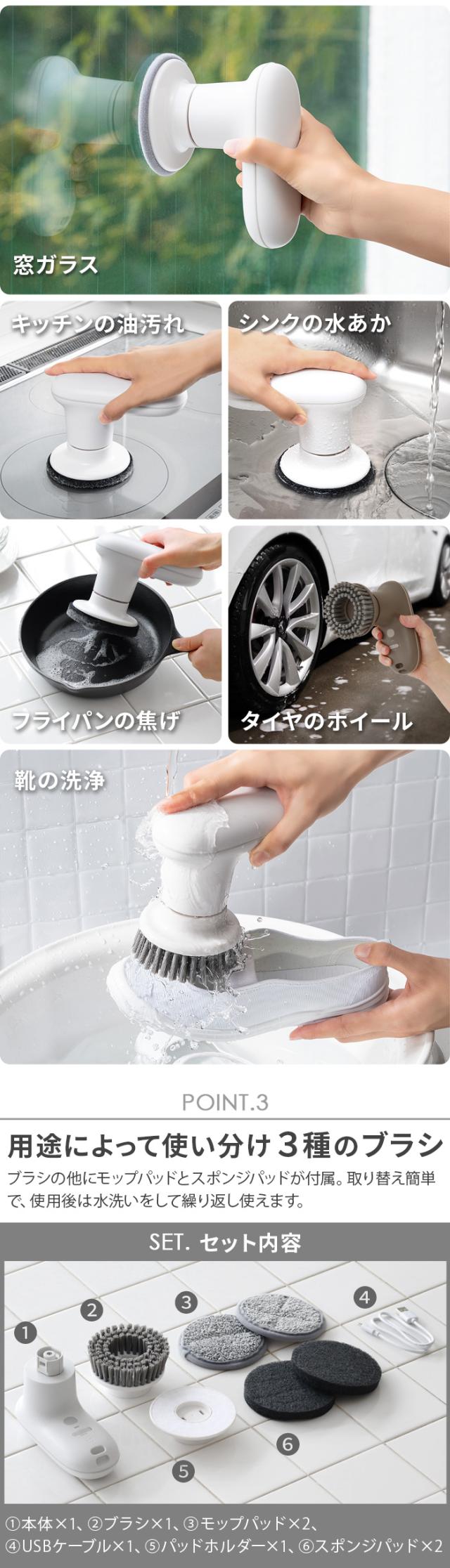 | 本体×1、ブラシ×1、パッドホルダー×1、モップパッド×2、スポンジパッド×2、USBケーブル(USB Type-C)×1 ※ACアダプタ(USB充電器)は同梱されません。別途ご用意ください。(5V 2.4A以上をご使用ください) |