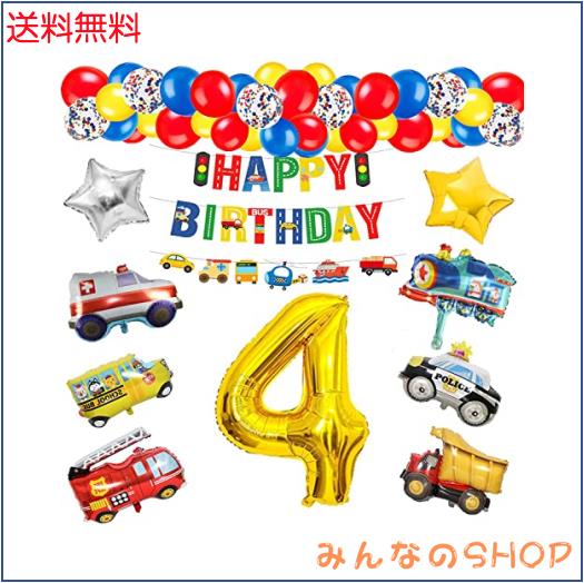 【商品セット内容】?90CM数字4バルーンx1 ?25.4cmゴム風船x36(赤色、青色、黄色、紙吹雪風船各9個) ?アルミ風船x6( 警察車両*1、列車*1、バスヨット*1、消防車*1、トラック*1、救急車*1 ) ?ゴールド五芒星バルーンx1 ?シルバーの五芒星バルーンx1 ?「HAPPY BIRTHDAY」バナーx1 ?小道具キット(リボンひも、両面テープ、バルーンチェーン) 男の子が大好きな車主題の誕生日飾り付けセット、4歳の男の子の誕生日プレゼントに人気です。