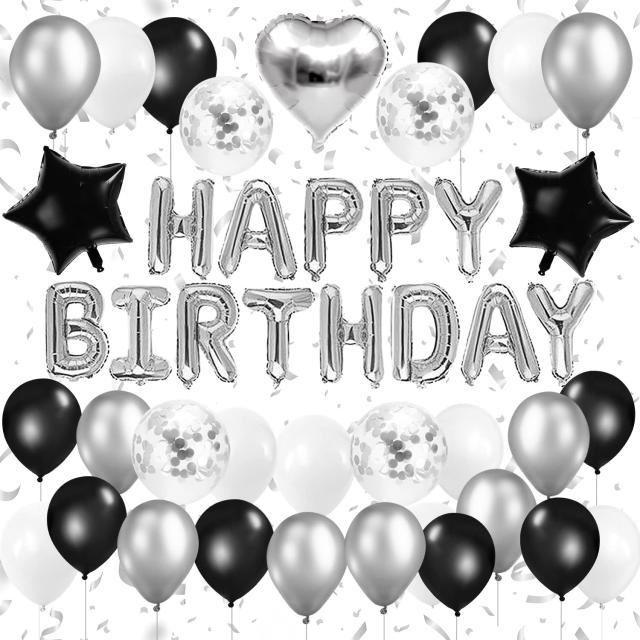 【豊富な飾りセット】?HAPPY BIRTHDAYアルミガーランド×1 ?ブラック風船×6個 ?シルバー風船×6個 ?ホワイト風船×4個?紙吹雪風船×4個 ?星形アルミバルーン×2個 ?ハートアルミバルーン×1個 ?シルバーリボン×10m ?ドットシール×40点 ?吸込管×1本 ※【商品】もし不具合か何か問題があれば、ぜひからとしてください。何卒よろしくお願いいたします。