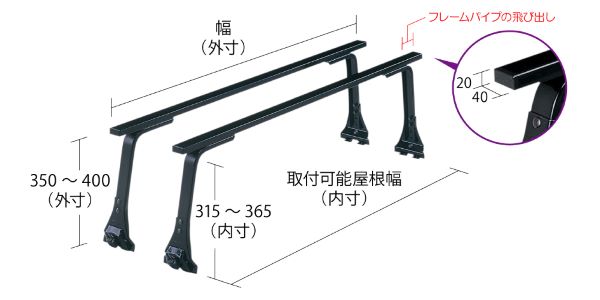 ※屋根幅が1377mm以上の場合はフレームパイプの飛出しがなくなります。