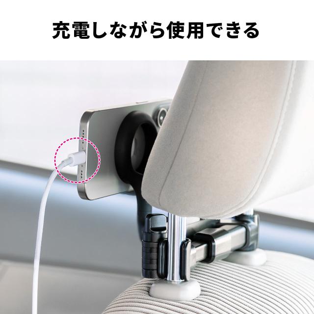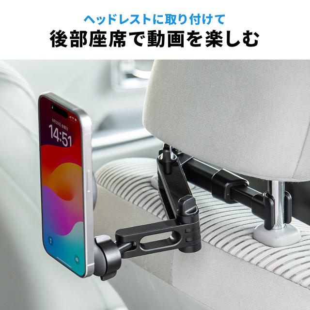 MagSafe対応車載ホルダー ヘッドレスト固定型 伸縮アーム 後部座席用 スマホホルダー 360度調整 片手操作 磁気吸着 iPhone15/14/13/12シリーズ対応 メタルリング付属[200-CAR107]