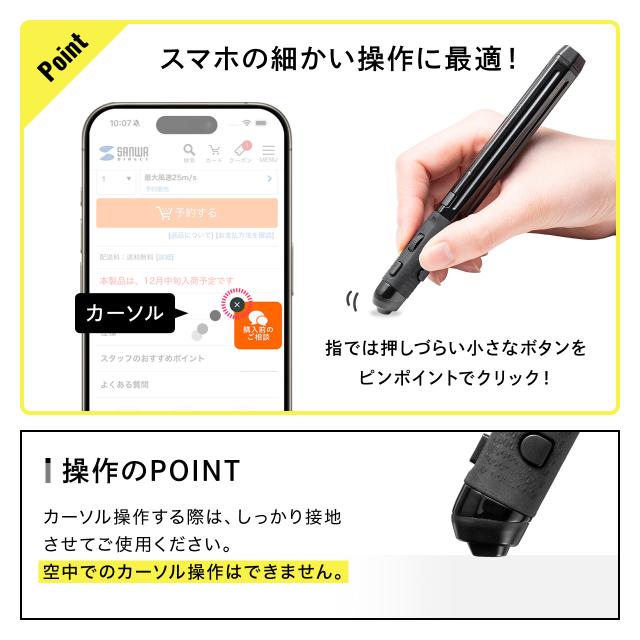⇒ご購入の前にご確認下さいペンを持つように操作できるペン型マウス。Bluetooth、Type-Aワイヤレス、Type-Cワイヤレス3種類の接続方法に対応。限られたスペースでの操作や、スマホの細かい操作に最適。持ち運びに便利なポーチ付き。電池交換が不要な充電式タイプ。ブラック。【WEB限定商品】