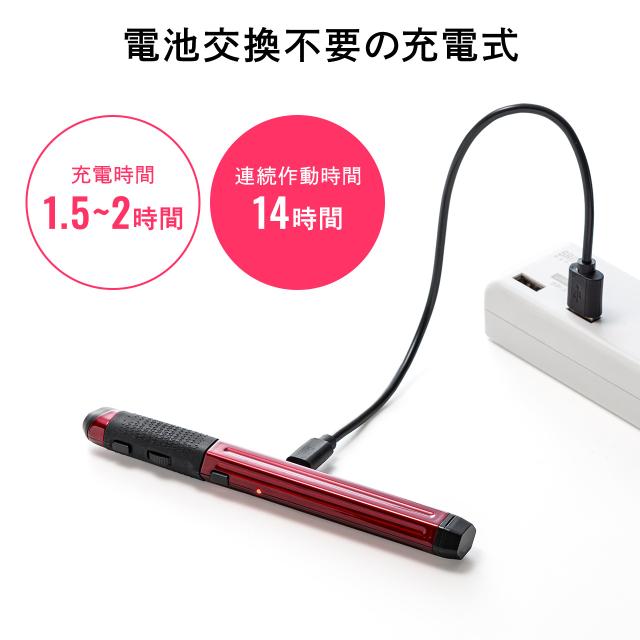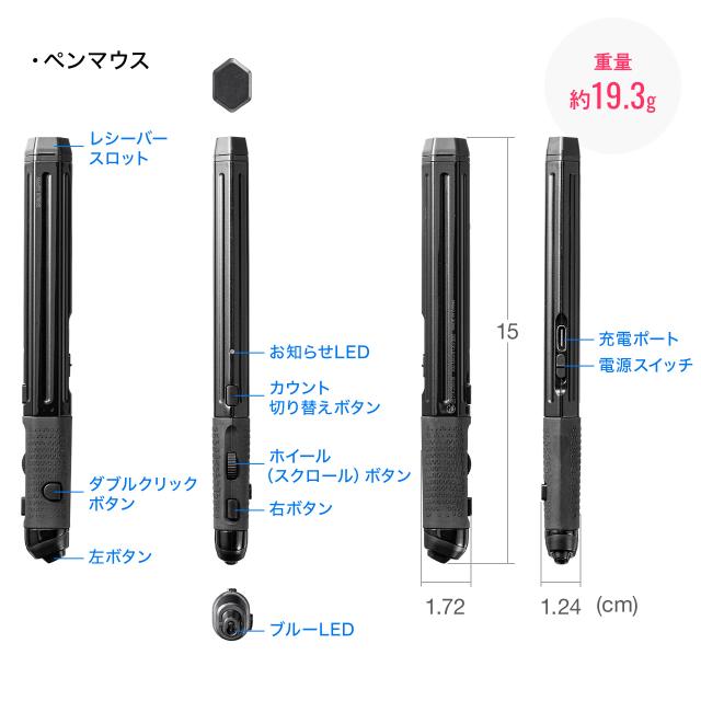 ペン型マウス Bluetooth ワイヤレス USB A Type-C 充電式 ペンマウス ブラック ブルー レッド[400-MAWBT202]