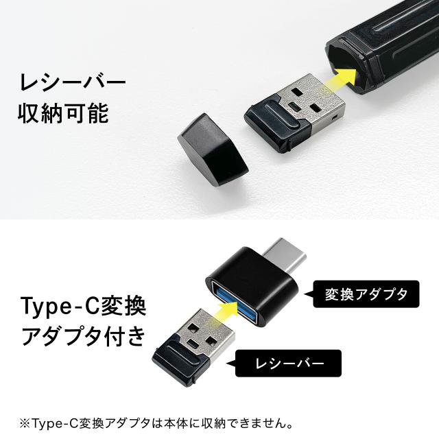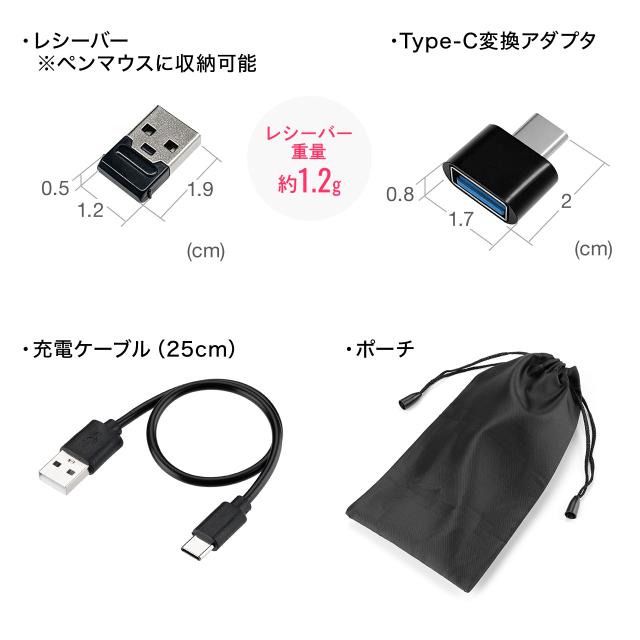 ■付属品:USB Aレシーバー、Type-C変換アダプタ、充電ケーブル(約25cm)、ポーチ
