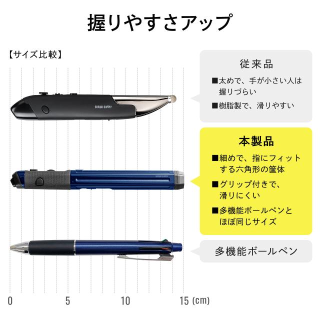 ●ペンのように握って使うことができるペンマウスです。●多機能ボールペンほどの細さで、グリップ付きで持ちやすく、自然な握り心地のマウスです。