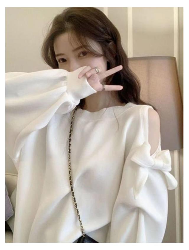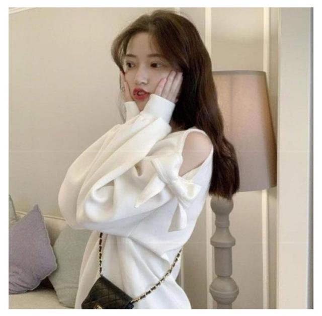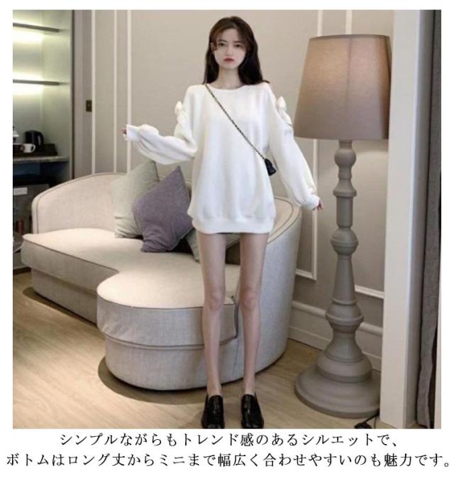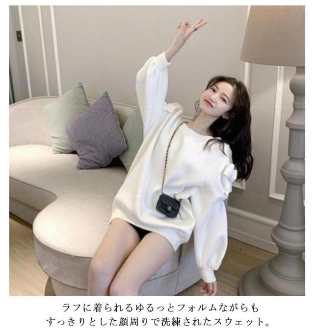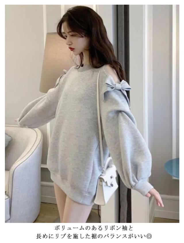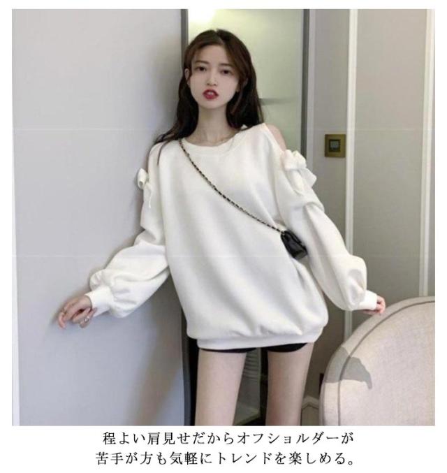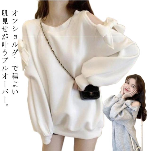 肩出しトレーナー レディース オフショルダー リボン トレーナー トップス ショルダーカット 長袖 ラウンドネック ゆるシルエット パフスリーブ オフショル スウェット トップス 肩出し プルオーバー ビッグシルエット 韓国ファッション