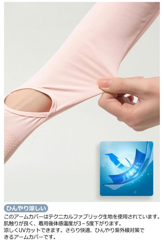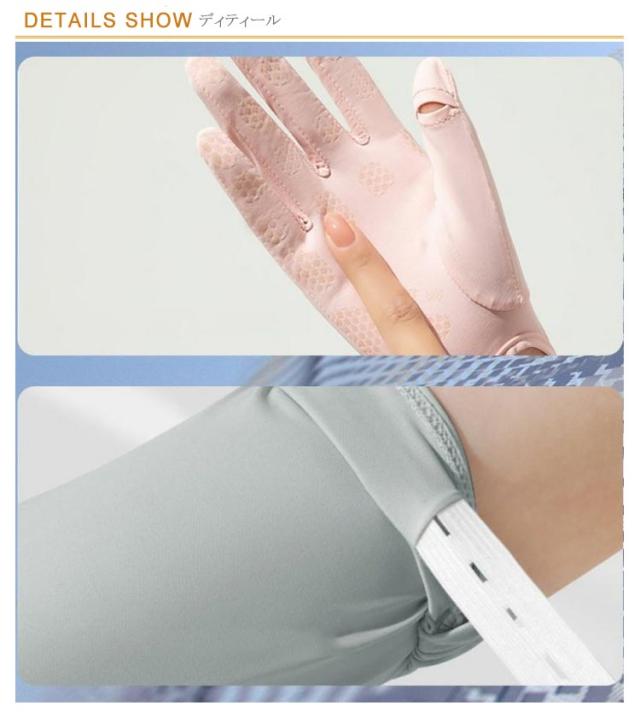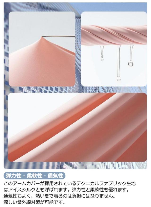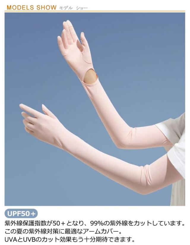 | 着けることでひんやり感を感じられるアームカバー 【手袋一体型】アームカバー+手袋のデザインで、腕から指先までしっかりUV対策できます。指先をスッと出せますので、スマホタッチの邪魔にならない。アームカバーの腕部分に手を出せる開け口もありまして、手を出したい時は簡単に手袋のみ脱げられます。 【滑り止め】 手のひら部分には滑り止めがついているので、サイクリング、運転などの時もしっかりハンドルを握ることができます。安全で安心して使用できます。肌触りが良い上で、しっかり物を持てます。 【ひんやり涼しい】このアームカバーはテクニカルファブリック生地を使用されています。肌触りが良く、着用後体感温度が3−5度下がります。涼しくUVカットできます。さらり快適、ひんやり紫外線対策できるアームカバーです。 【UPF50+】紫外線保護指数が50+となり、99%の紫外線をカットしています。この夏の紫外線対策に最適なアームカバー。UVAとUVBのカット効果もう十分期待できます。 【弾力性・柔軟性・通気性】 このアームカバーが採用されているテクニカルファブリック生地はアイスシルクとも呼ばれます。弾力性と柔軟性も優れます。通気性もよく、熱い夏で着るのは負担にはなりません。涼しい紫外線対策が可能です。 | |
