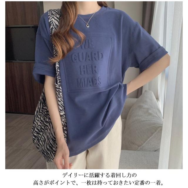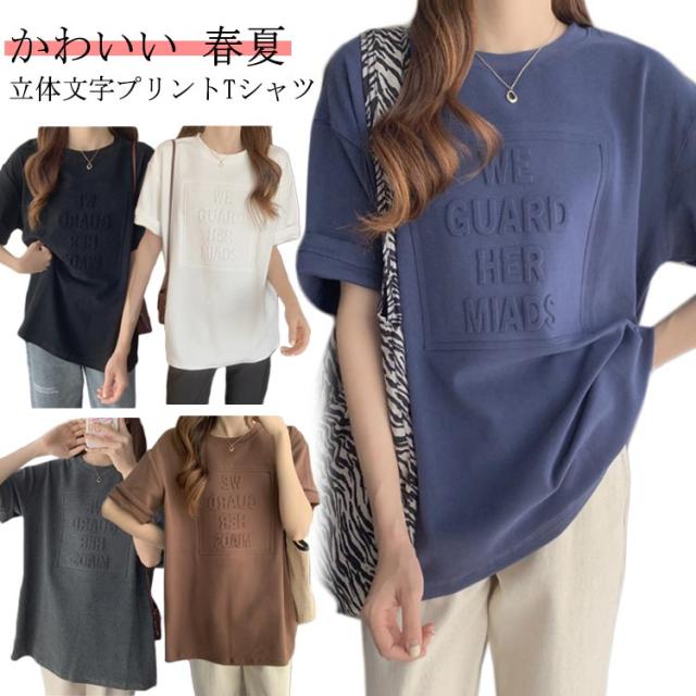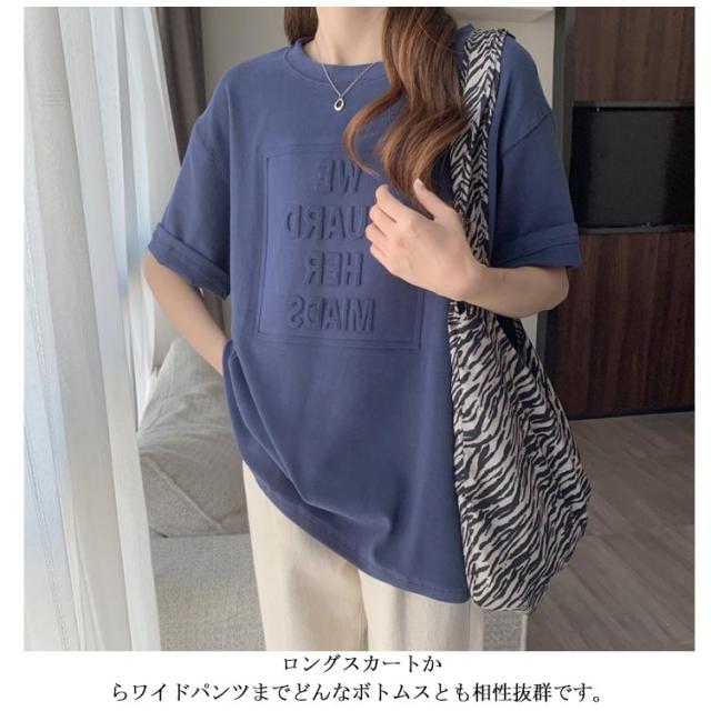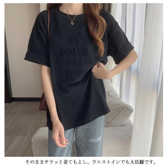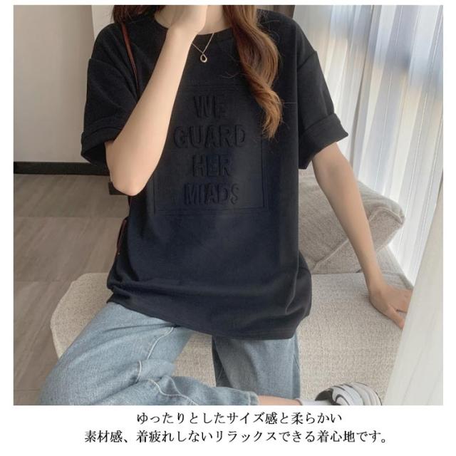 Tシャツ 半袖 カットソー ティーシャツ エンボス加工 プリントTシャツ 立体 3D デコボコ 英字 ロゴ クルーネック 重ね着 トップス プルオーバー リラックス 春夏 おしゃれ 体型カバー カジュアル 通勤 韓国ファッション 春夏 送料無料