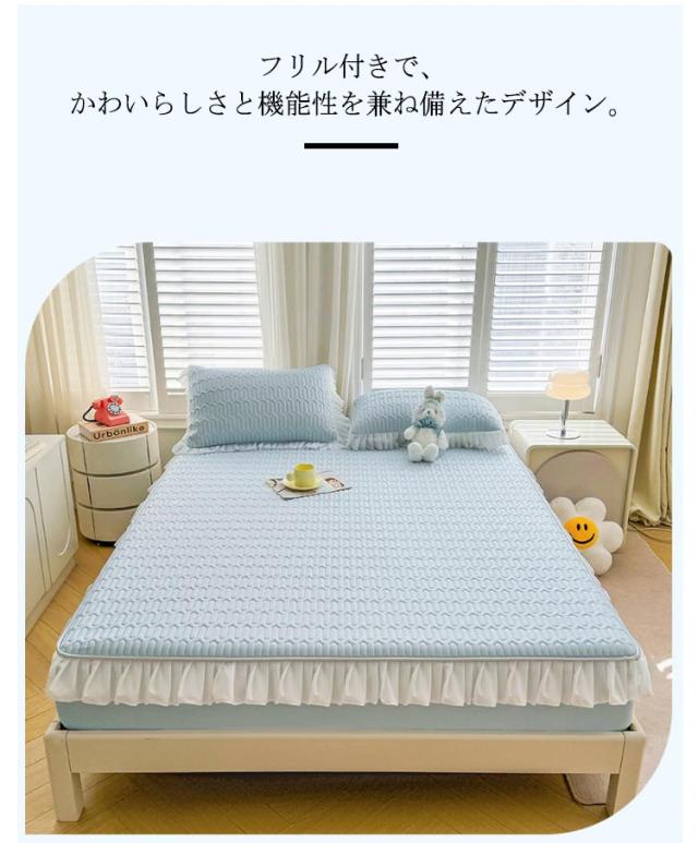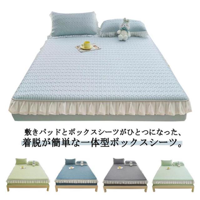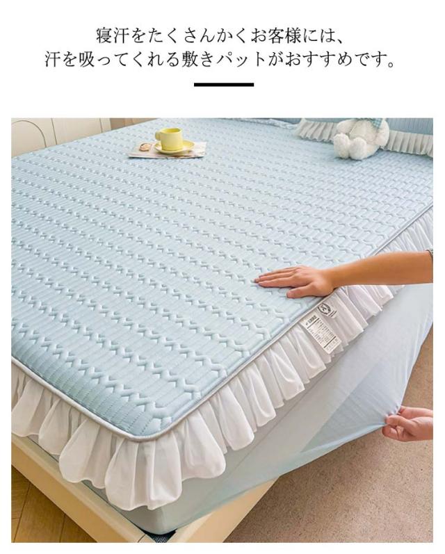 | 敷きパッドとボックスシーツがひとつになった、着脱が簡単な一体型ボックスシーツ。 フリル付きで、かわいらしさと機能性を兼ね備えたデザイン。 ズレ防止全周ゴム付きで寝返りしてもズレません。 吸湿性、吸汗性がよく 春 夏 秋 冬 オールシーズン対応! 就寝中の寝汗もしっかり吸収!ベタつかず気持ちよくお使いいただけます。 寝汗をたくさんかくお客様には、汗を吸ってくれる敷きパットがおすすめです。 | |