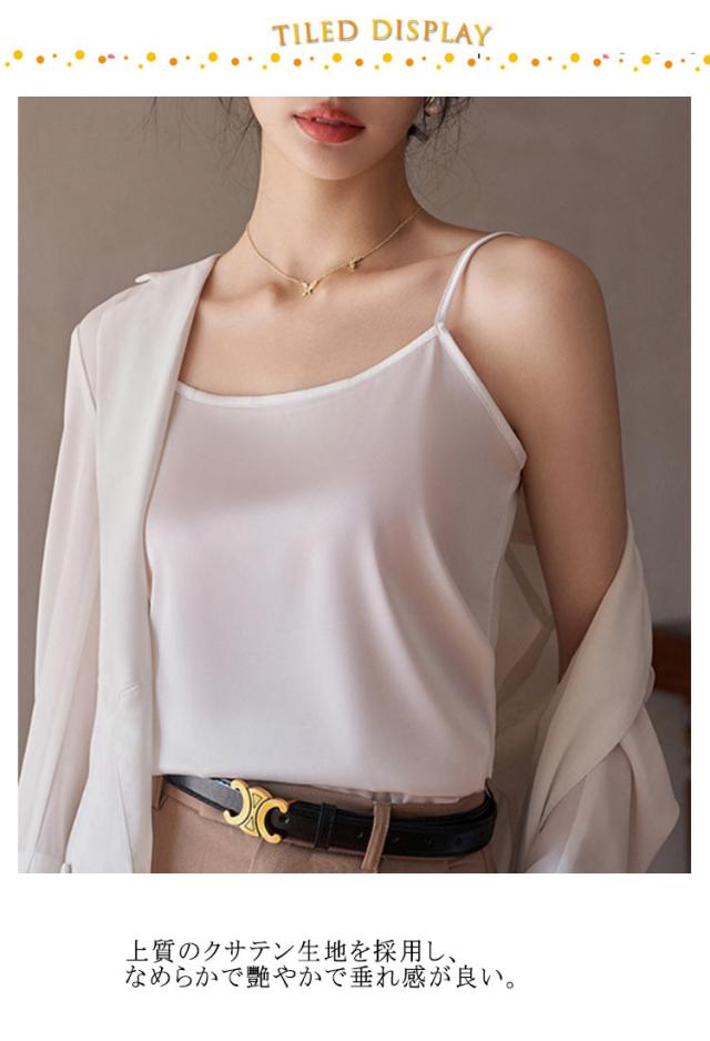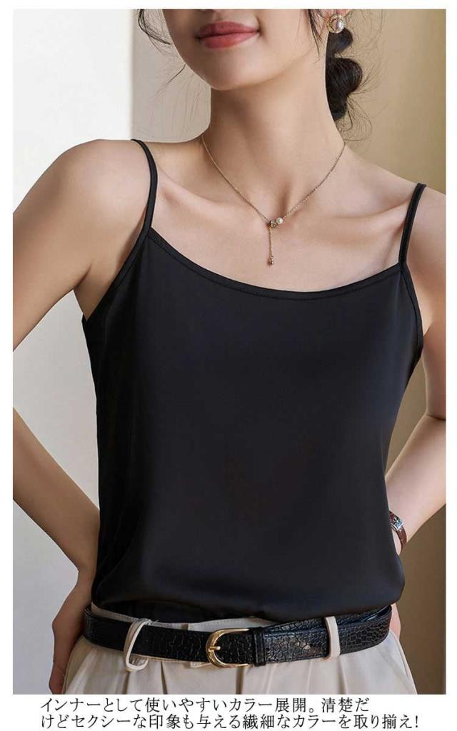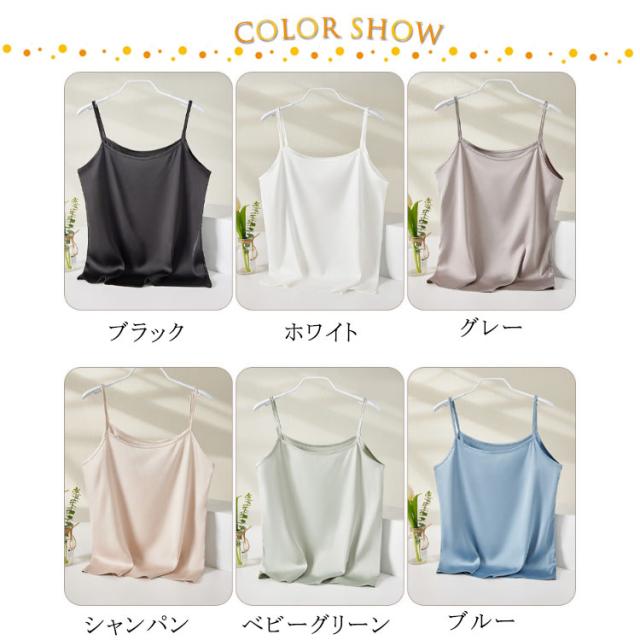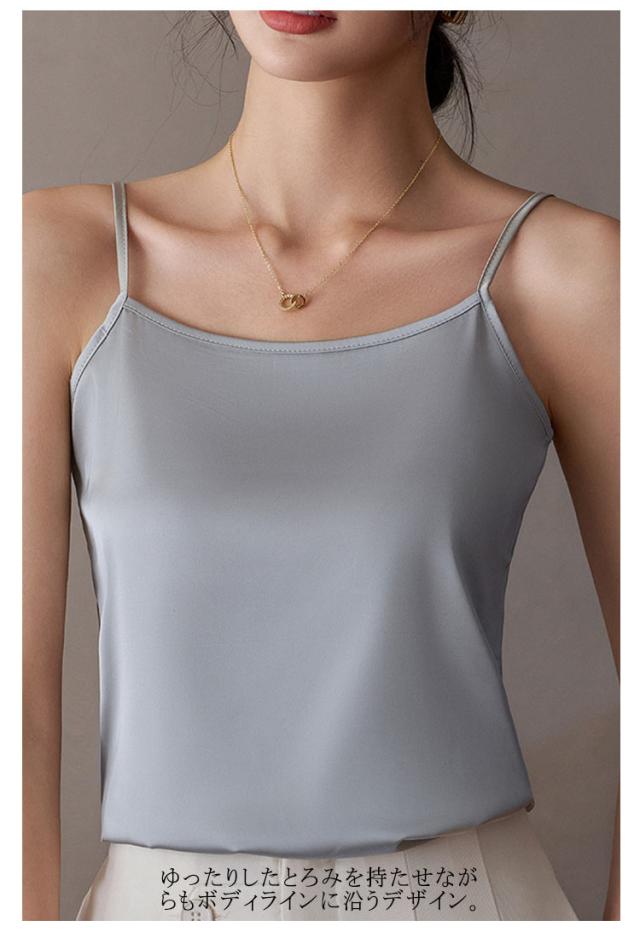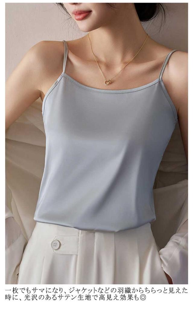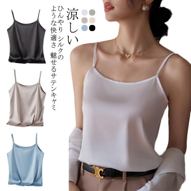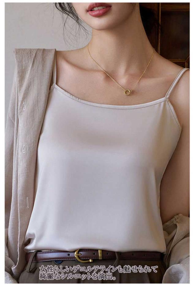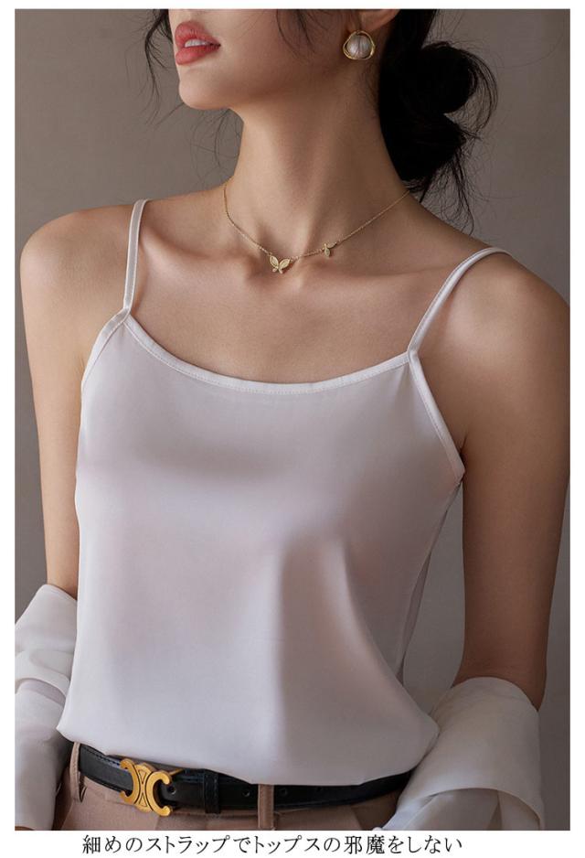 | ひんやり シルクのような快適さ 魅せるサテンキャミ 上質のクサテン生地を採用し、なめらかで艷やかで垂れ感が良い。 涼しいアイスシルク、軽くてフィット感と柔らかく通気性があり、夏の蒸し暑さを解消し。 一枚でもサマになり、ジャケットなどの羽織からちらっと見えた時に、光沢のあるサテン生地で高見え効果も◎ 細めのストラップでトップスの邪魔をしない。 ゆったりしたとろみを持たせながらもボディラインに沿うデザイン。 女性らしいデコルテラインも魅せられて綺麗なシルエットを演出。 インナーとして使いやすいカラー展開。清楚だけどセクシーな印象も与える繊細なカラーを取り揃え! | |