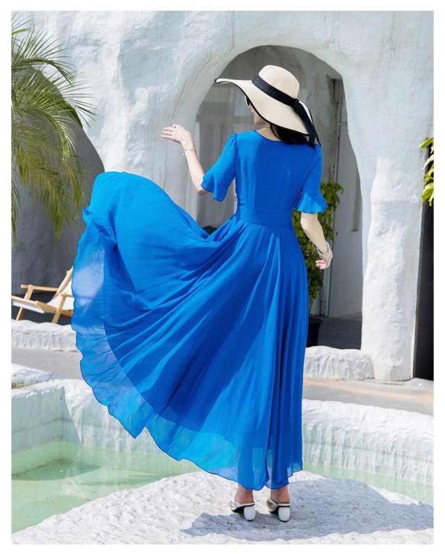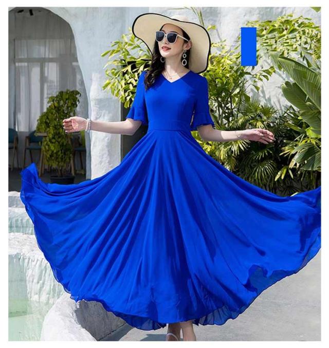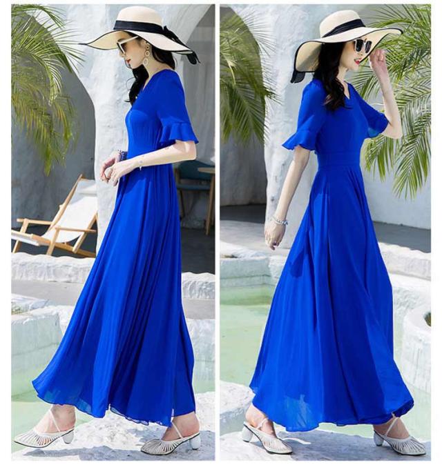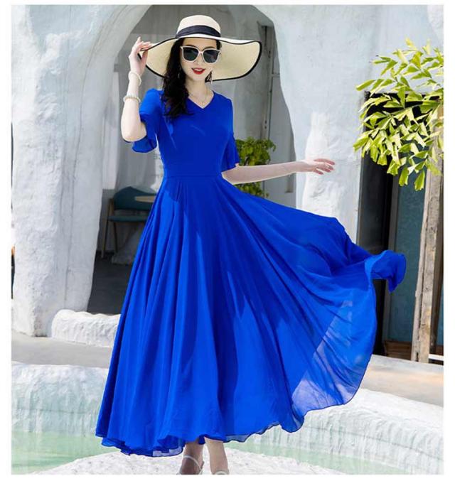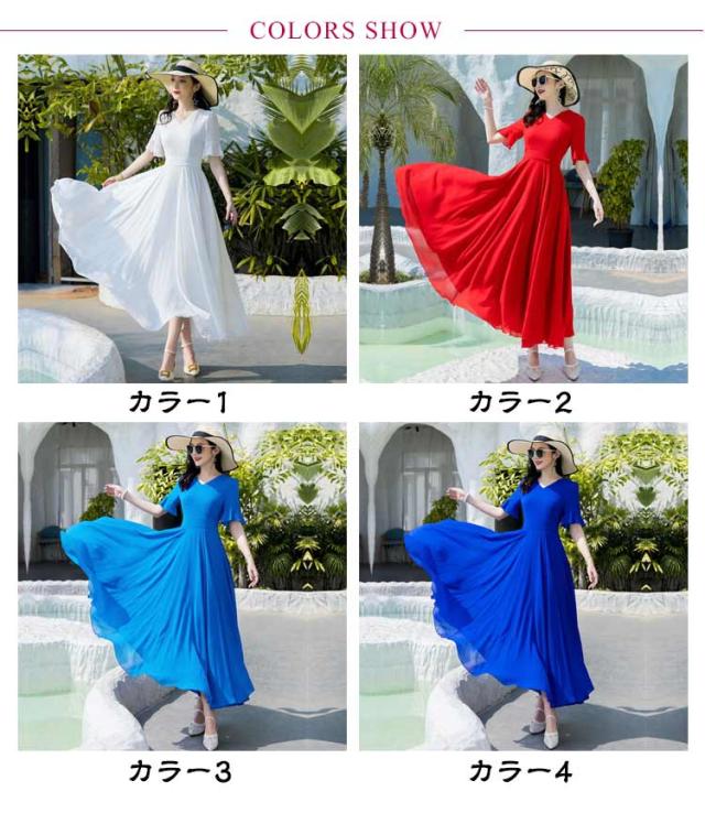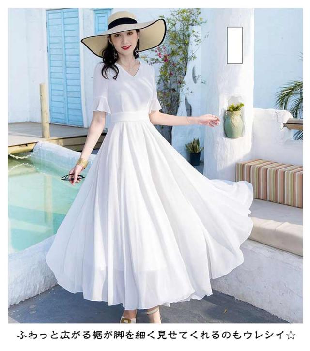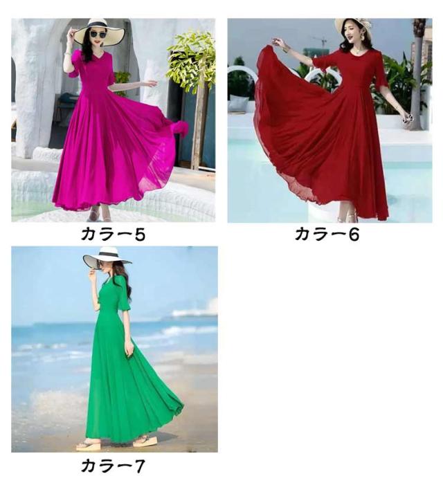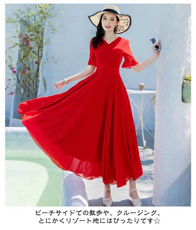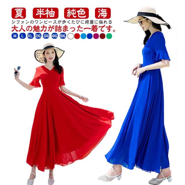 マキシワンピース サマーワンピース レディース 夏 半袖 リゾートワンピース ボヘミアン ロング丈 フレアワンピース 純色 フリル袖 マキン丈 夏ワンピー 体型カバー リゾート カジュアル パーティー デート ビーチ 海 30代 40代 50代