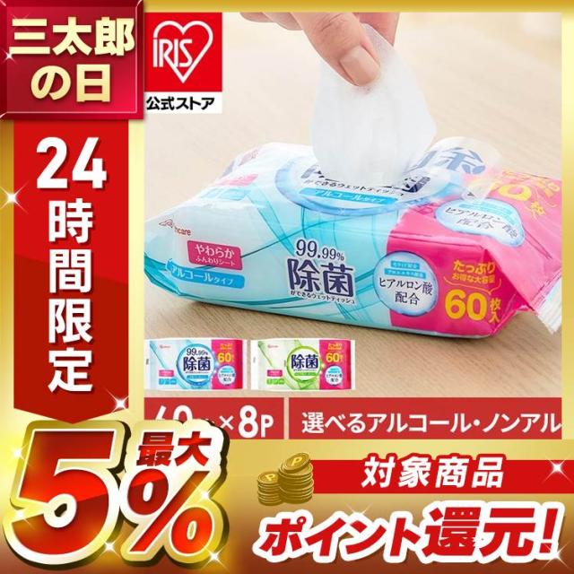 【480枚】 ウェットティッシュ 除菌シート 99.99%除菌 アルコール ノンアルコール 持ち運び 携帯用 除菌 ウエットティッシュ 拭き取り 掃除 アウトドア お出かけ 防災 災害 備蓄 除菌ウェットティッシュ アイリスオーヤマ 大容量 WTS-60A WTS-60N *