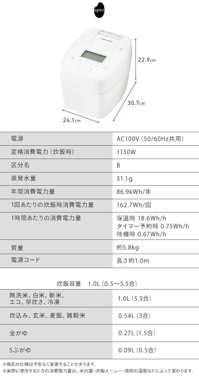 ※実際に使用するときの消費電力量は、米の量・炊飯のメニュー・周囲の温度などによって変わります。