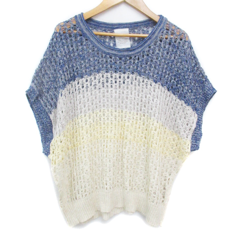 【中古】エージープラス ニット カットソー 半袖 マルチボーダー柄 リネン混 M 紺 ベージュ ネイビー レディース