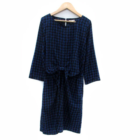 【中古】インデックス INDEX ワンピース ラウンドネック 長袖 ロールアップ ひざ丈 総柄 M 紺 ネイビー 黒 レディース