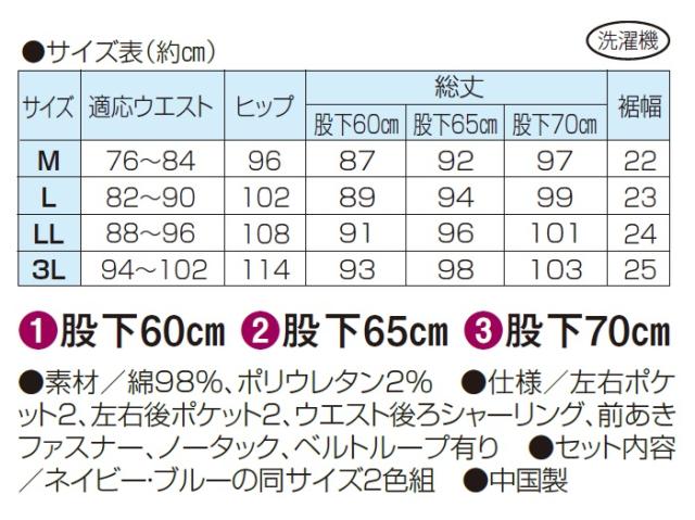 後ろシャーリング仕様で、窮屈になりがちなウエストもらくらく快適です。股下は60cm、65cm、70cmで裾上げしてあり、ご購入後すぐにご着用頂けます。