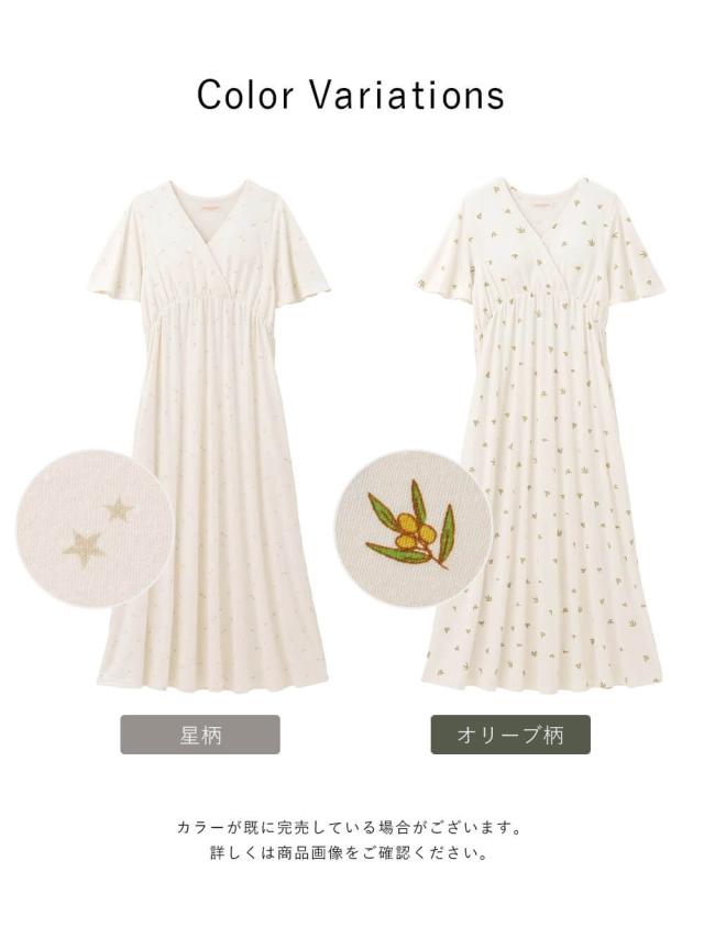 星柄・オリーブ柄スムースカシュクールパット付半袖ネグリジェ【出産後も長く使える】