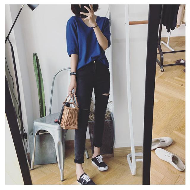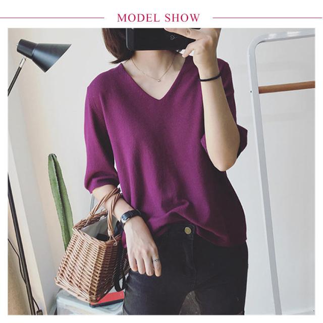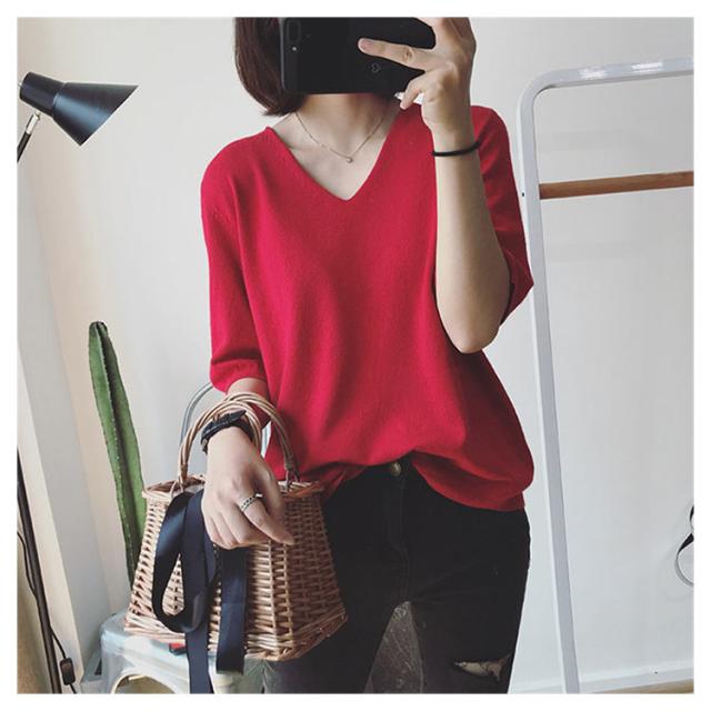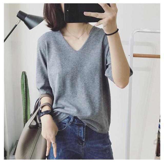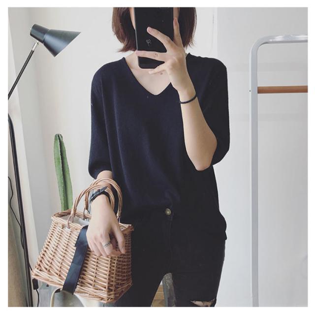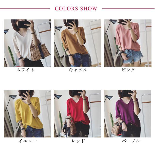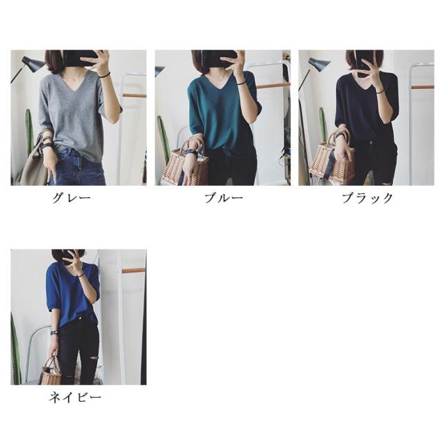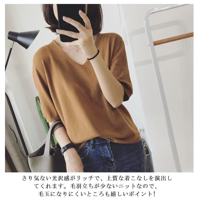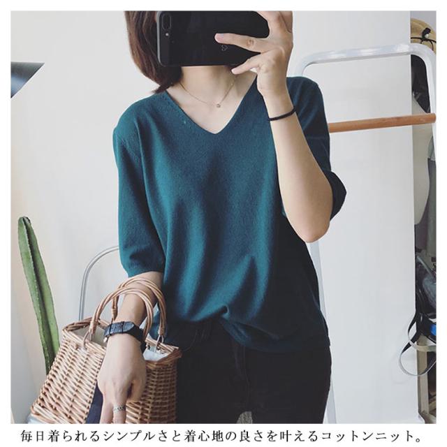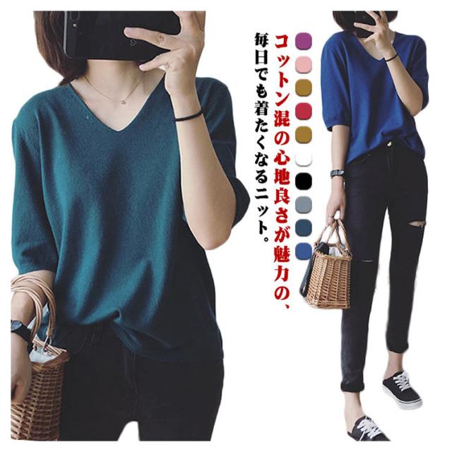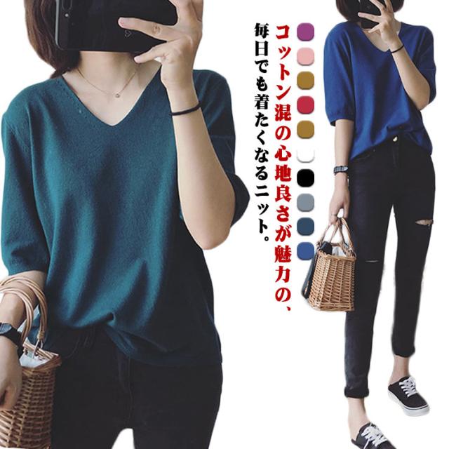 サマーニット シンプル Vネック 無地 レディース 夏 ニット 春 Tシャツ トップス 5分袖 ニットソー カットソー 半袖 プルオーバー ドロップショルダー ゆったり ニット オフィス カジュアル きれいめ コットン混 無地 体型カバー