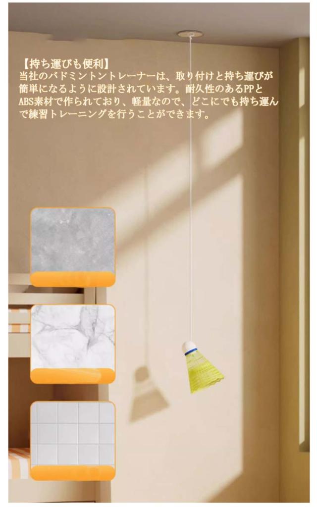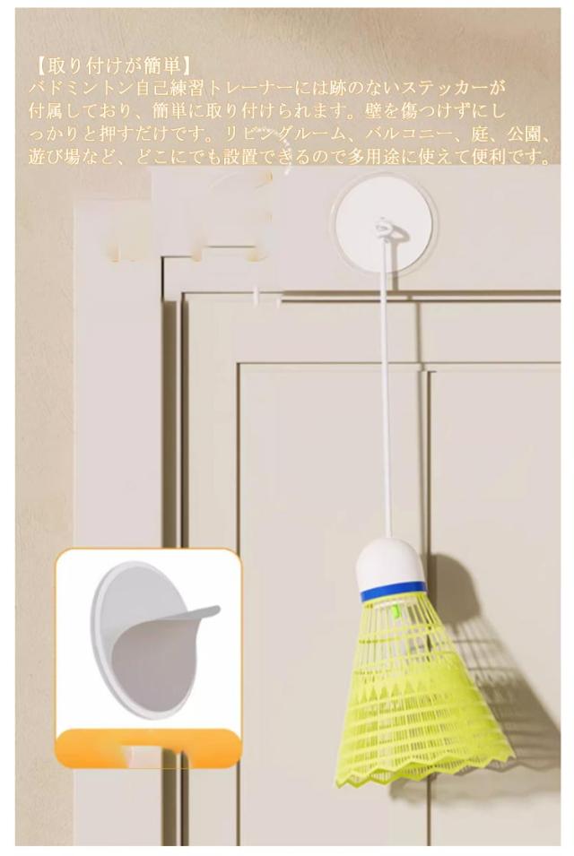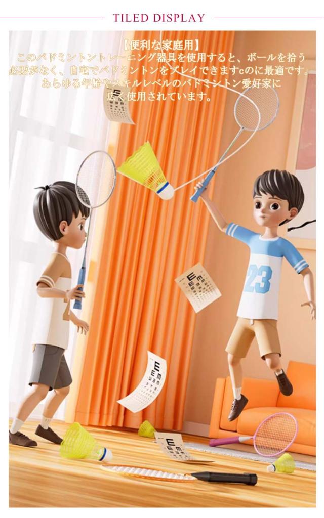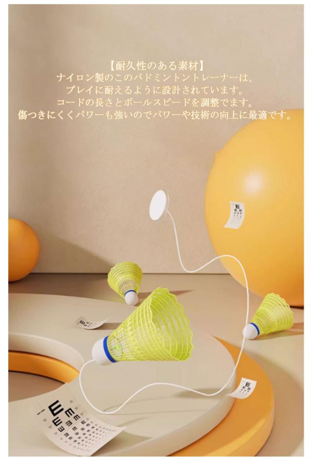 | ボールを拾う必要がなく、自宅で楽しく楽しくトレーニングする室内バドミントン ラケット*1枚+ボール*3個セット 収納袋付き 【便利な家庭用】 このバドミントントレーニング器具を使用すると、ボールを拾う必要がなく、自宅でバドミントンをプレイできますcのに最適です。 あらゆる年齢やスキルレベルのバドミントン愛好家に広く使用されています。 【耐久性のある素材】 ナイロン製のこのバドミントントレーナーは、プレイに耐えるように設計されています。 コードの長さとボールスピードを調整でます。傷つきにくくパワーも強いのでパワーや技術の向上に最適です。 【取り付けが簡単】 バドミントン自己練習トレーナーには跡のないステッカーが付属しており、簡単に取り付けられます。壁を傷つけずにしっかりと押すだけです。 リビングルーム、バルコニー、庭、公園、遊び場など、どこにでも設置できるので多用途に使えて便利です。 【持ち運びも便利】 当社のバドミントントレーナーは、取り付けと持ち運びが簡単になるように設計されています。耐久性のあるPPとABS素材で作られており、軽量なので、どこにでも持ち運んで練習トレーニングを行うことができます。 | |