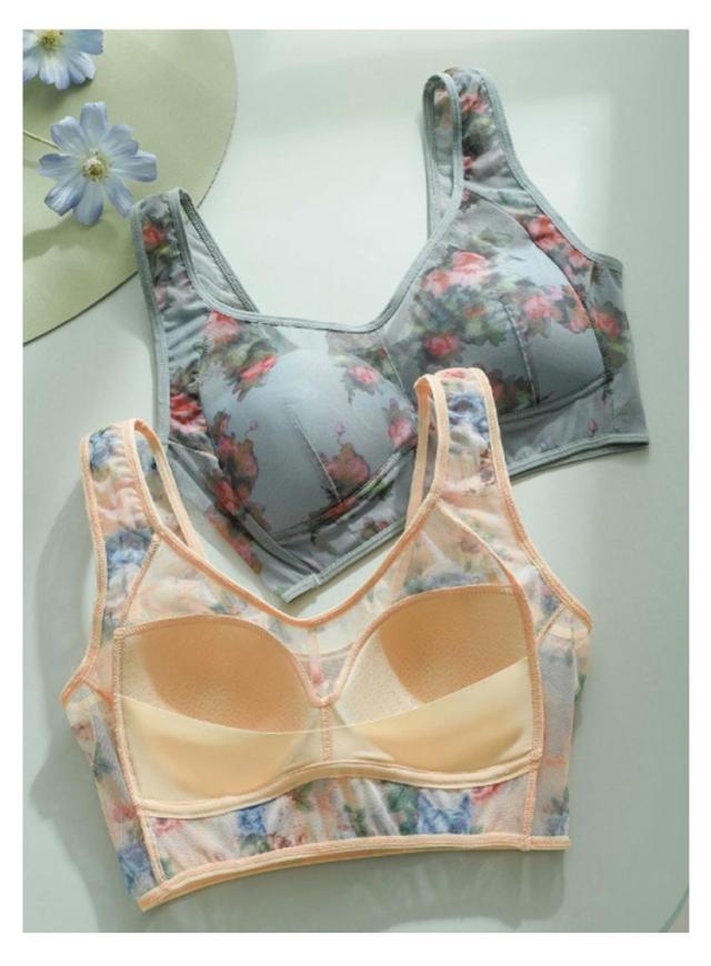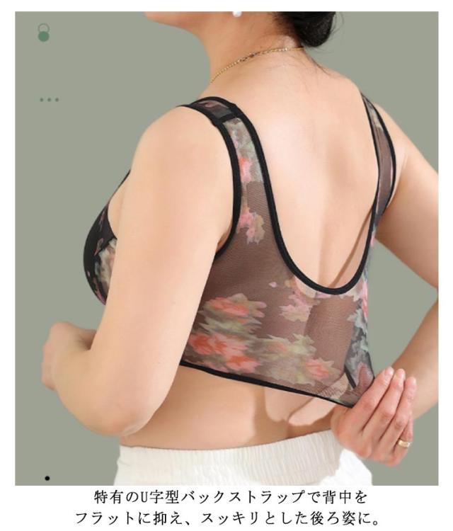 | 締め付け感ゼロ!大きな胸を小さく見せるブラ。 やや薄手のカップで、ボリュームが出すぎないのも嬉しいポイント。 ノンワイヤーでもバストをしっかり覆ってしっかり支えます。 花柄レースがしっかり胸をつつんで綺麗なシルエットを作ります。 脇高&幅広設計で背中から脇にかけてのハミ肉をしっかり支え、サイドのラインをすっきりととのえる。 肩にくい込みにくい幅広ストラップは、肌側がポコポコしているからズレにくく快適です。 特有のU字型バックストラップで背中をフラットに抑え、スッキリとした後ろ姿に。 | |