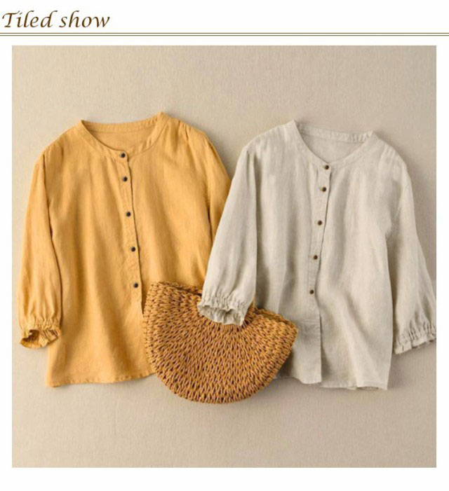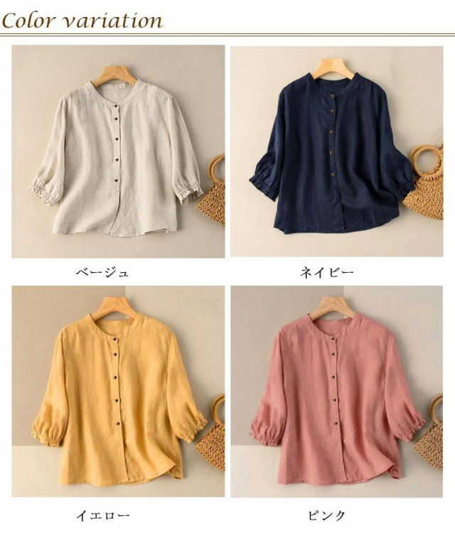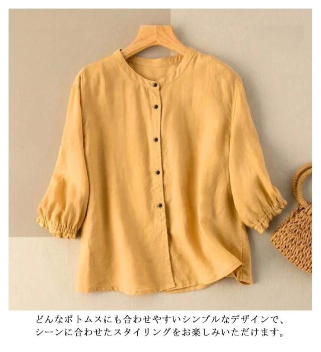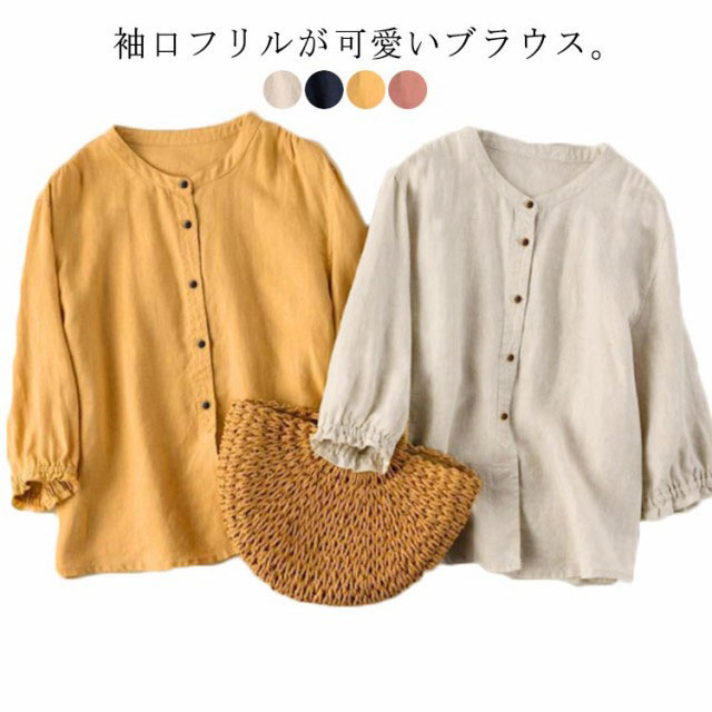 前開き ブラウス 綿麻 リネンブラウス ナチュラル 七分袖 ブラウス レディース 春夏 スタンドカラー トップス フリル袖 リネン キレイめ 無地 おしゃれ ゆったり かわいい 大きいサイズ