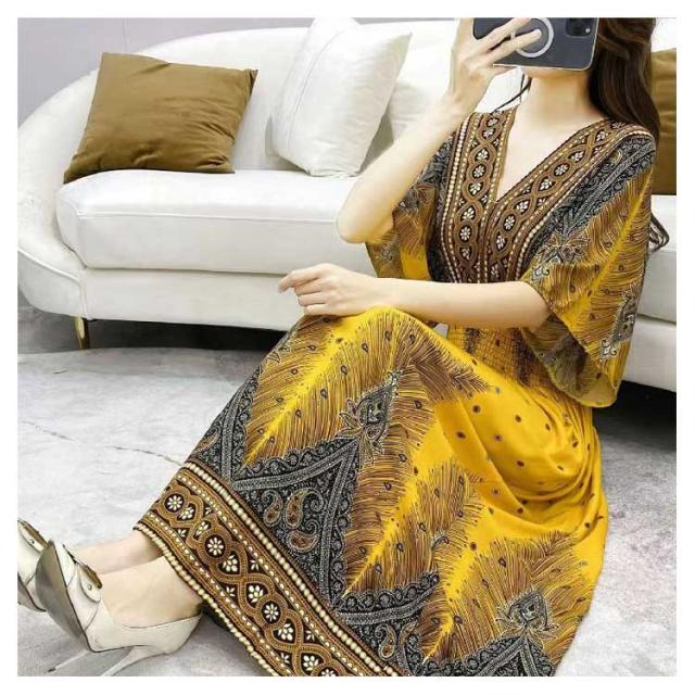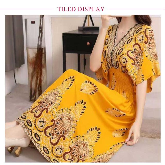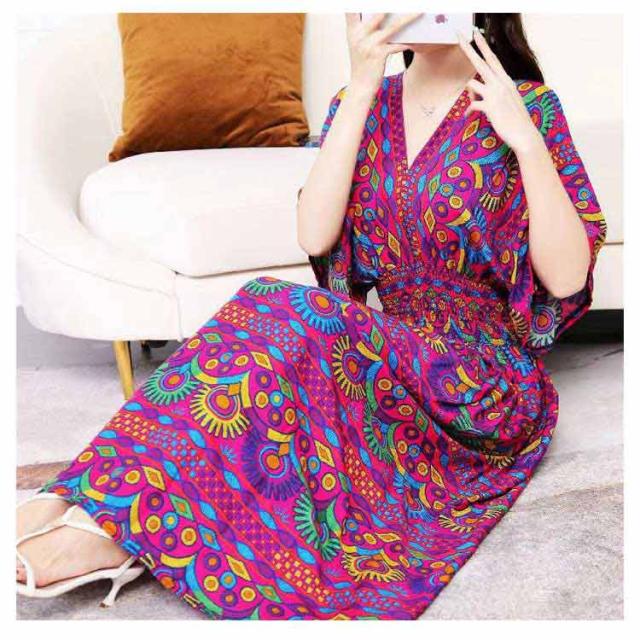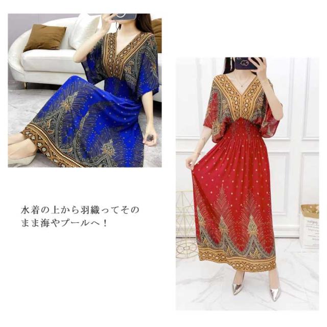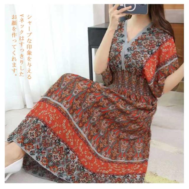 Vネック 総柄 半袖 夏 エキゾチック 花柄 おしゃれ エスニック リゾート マキシ丈 ウェストゴム 柔らかい ロング丈 フリーサイズ 個性的 きれいめ ロング アジアン ワンピース 海 沖縄 海外旅行 ビーチ