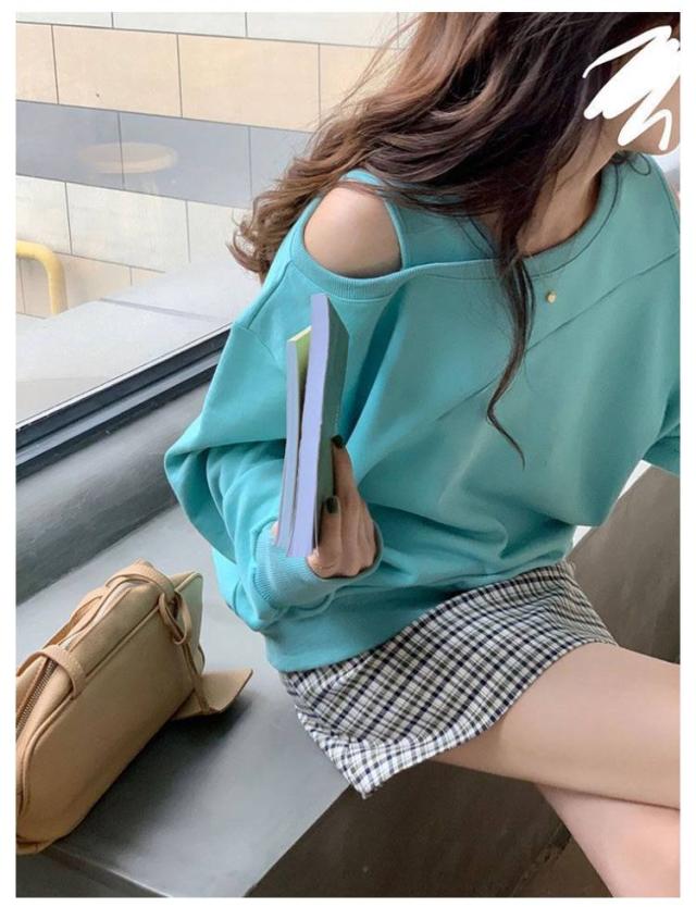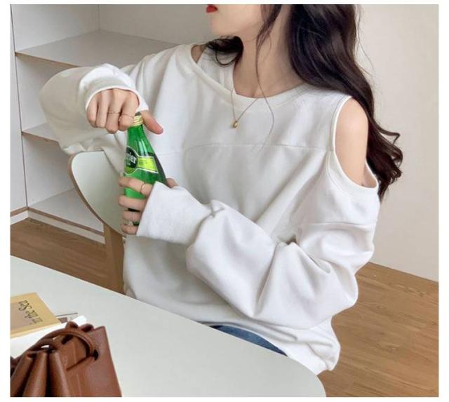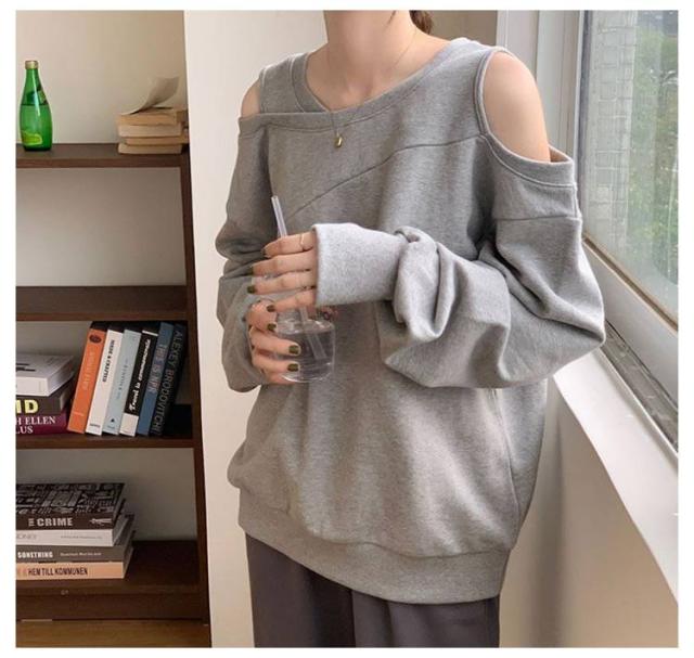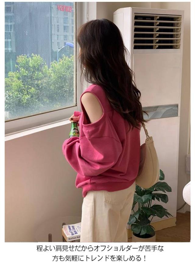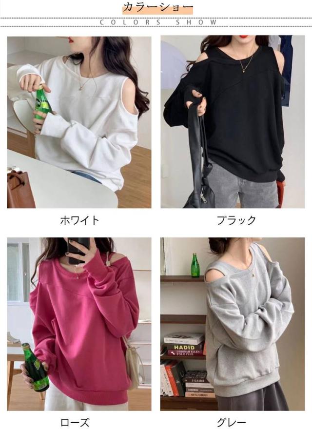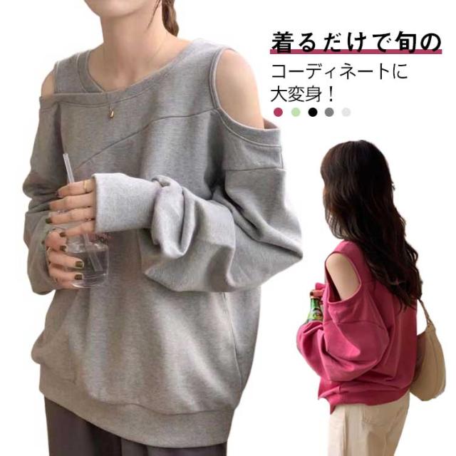 長袖 スウェット レディース トレーナー アシメ ラウンドネック トップス オフショルダー オフショルダー 肩出し ショルダーオープン 春 オフショル スウェット ゆったり カジュアル 無地 オーバーサイズ 韓国ファッション ホワイト ブラック ローズ グレー