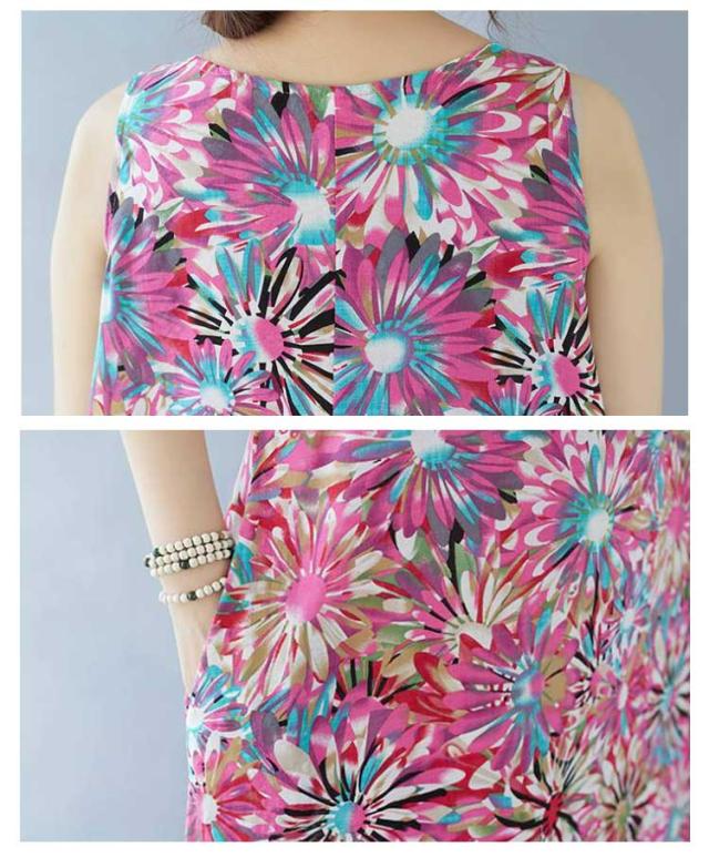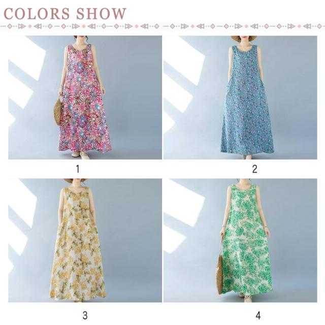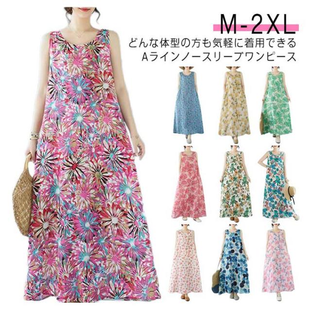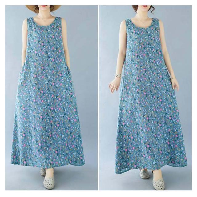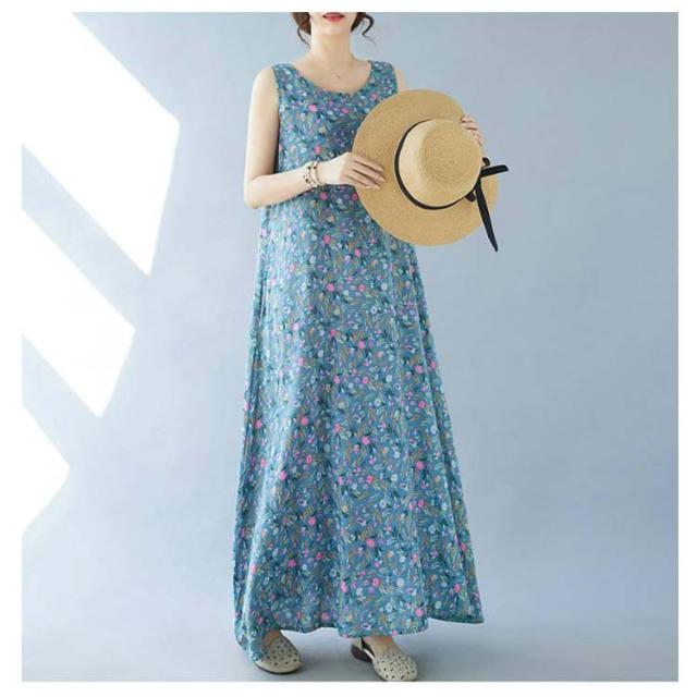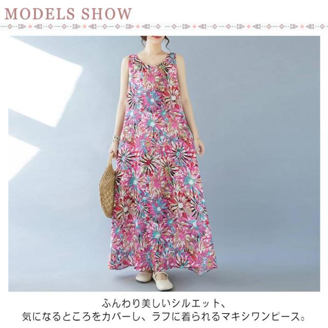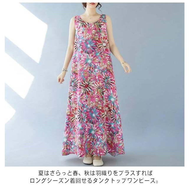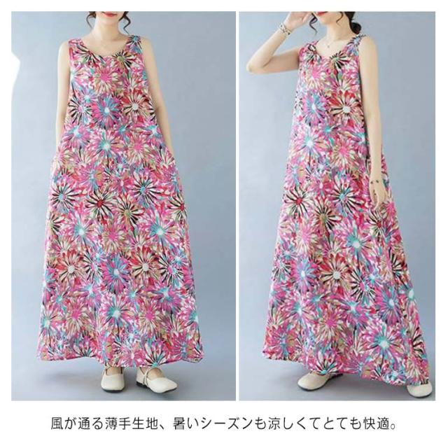 ノースリーブワンピース 重ね着 ゆったり マキシ丈ワンピース ワンピース 花柄 総柄 夏 レイヤード 送料無料 送料無料 レディース ロングワンピース 森ガール ポケット付き フレア クルーネック ワンピース