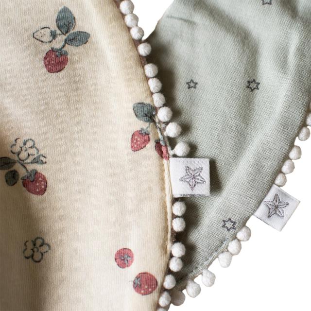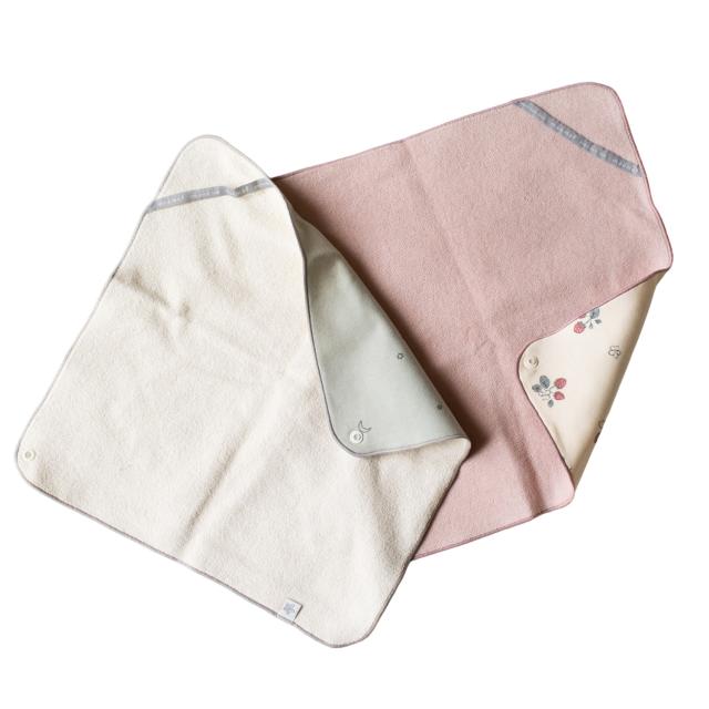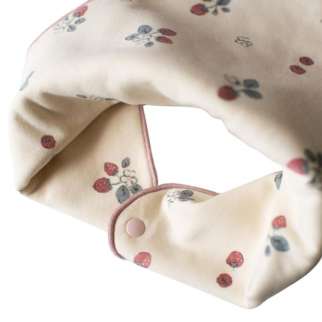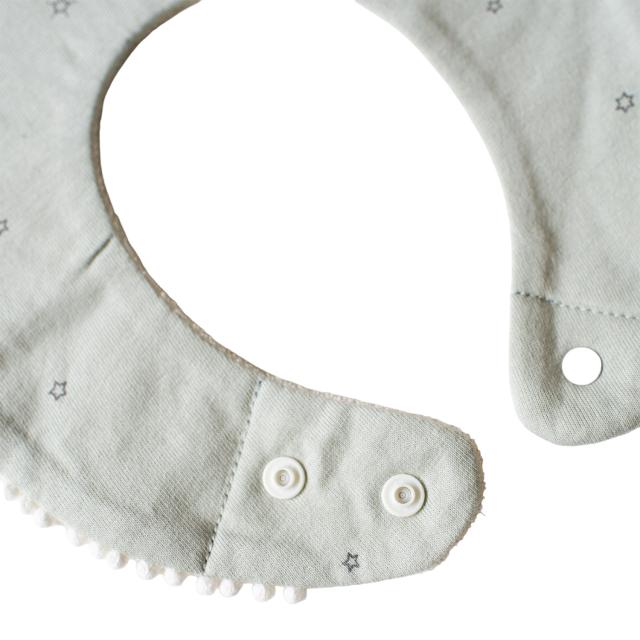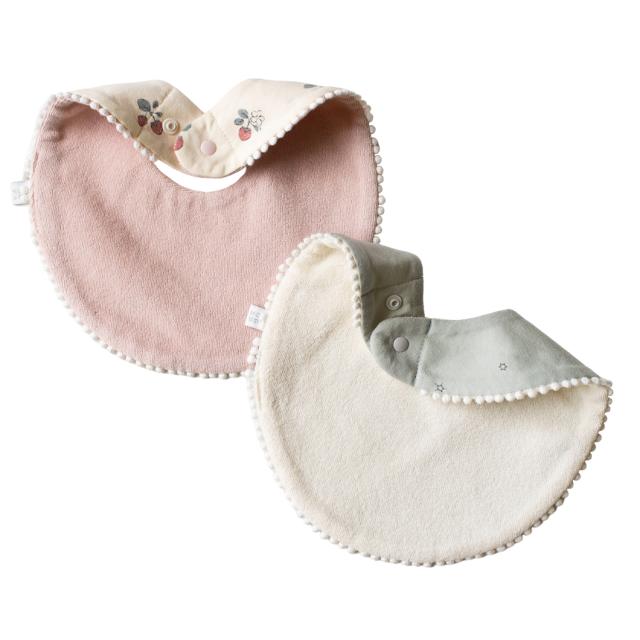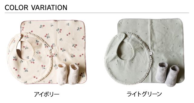 スタイ、ハンカチ、ふわふわソックスの3点が入ったギフトセットです。スタイは柔らかいフライスとパイルの生地を使用したリバーシブル仕様。コーディネートに合わせて二通りのデザインを楽しめます。ハンカチは、端のスナップボタンを止めるとスカーフ風のスタイとしても使用可。裏にループがついているのでベビーカーなどに吊り下げて持ち運びにも便利です。サイズを選ぶ必要がなく、クリアボックスに入っているので出産祝いのプレゼントにもおすすめです。