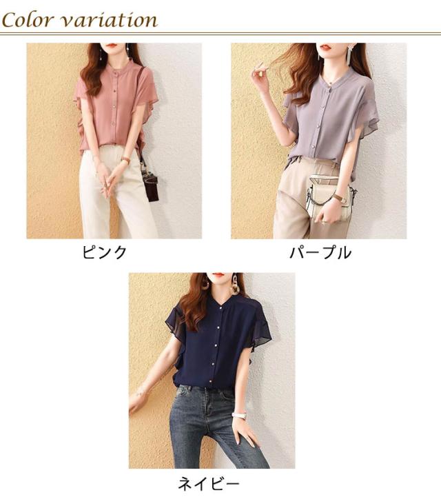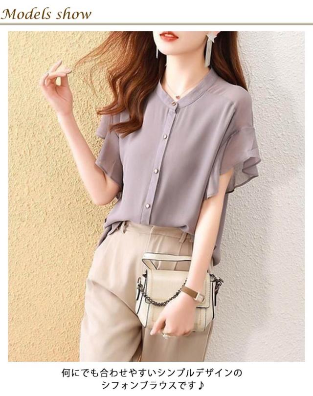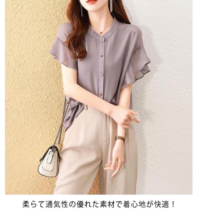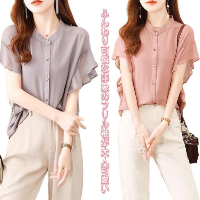 フレアスリーブ レディース シャツ トップス フレア袖 無地 フォーマル 前開きシャツ 夏コーデ フリル 半袖ブラウス フレンチスリーブ オフィス 薄手 OL カジュアル 通勤 レディース 結婚式 パーティー