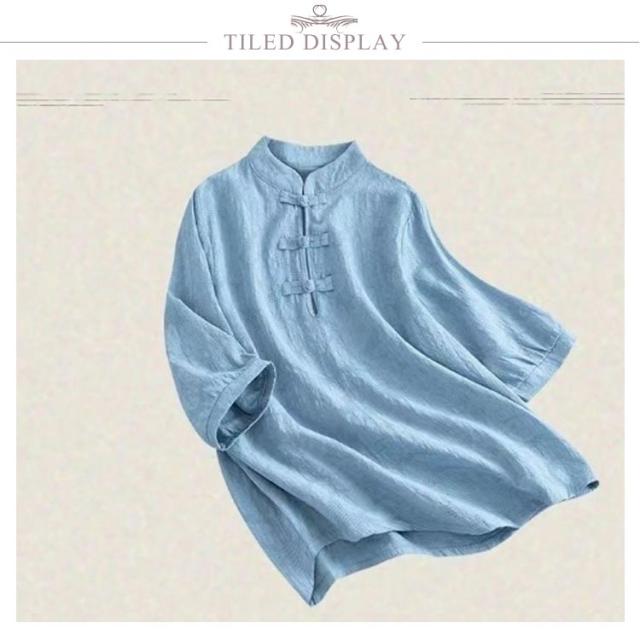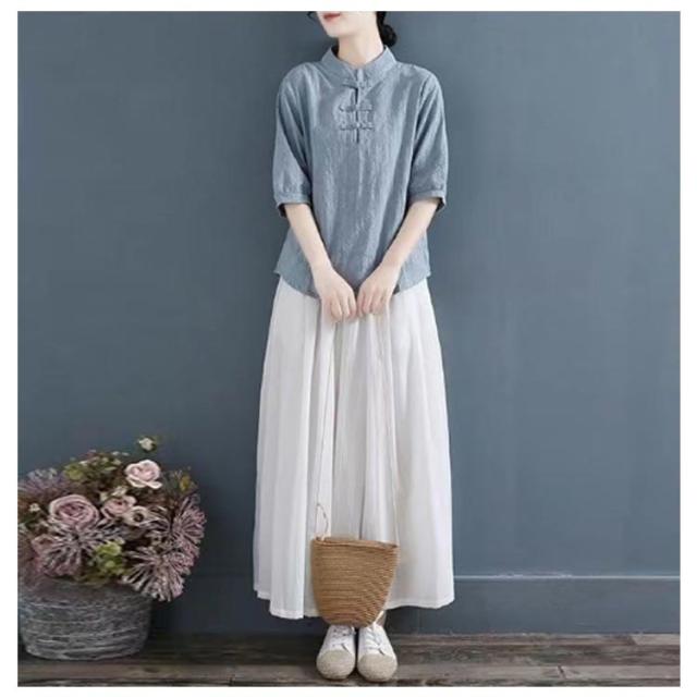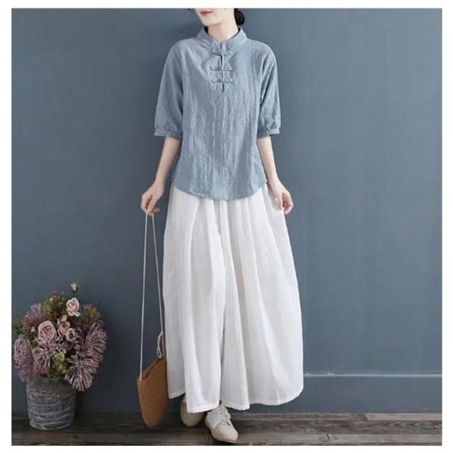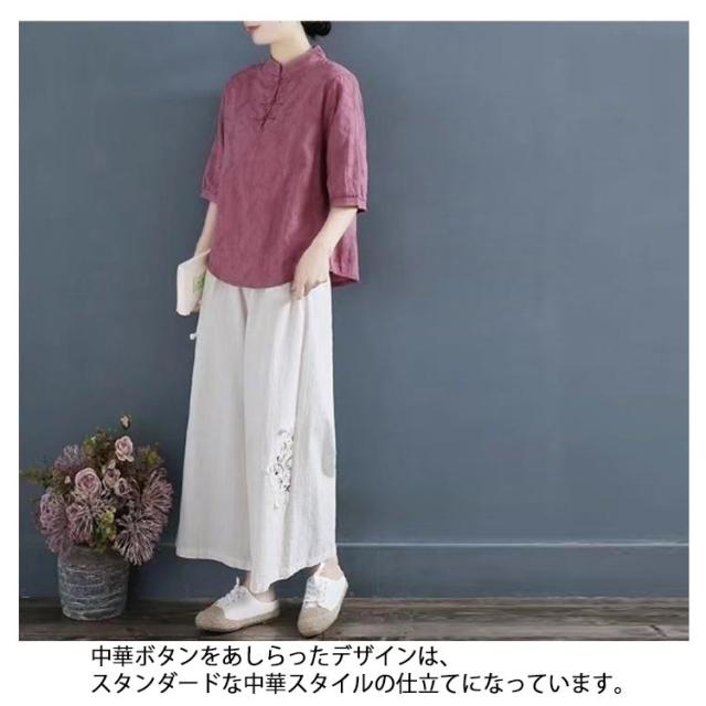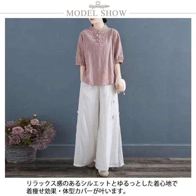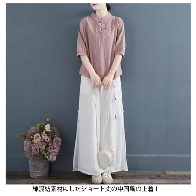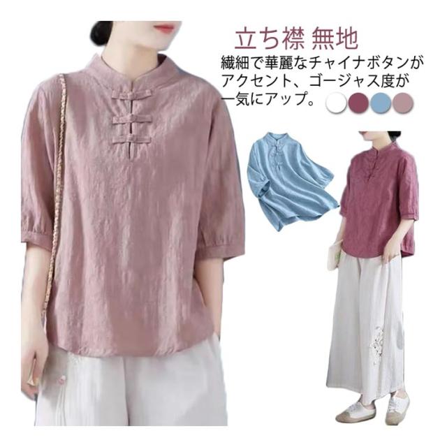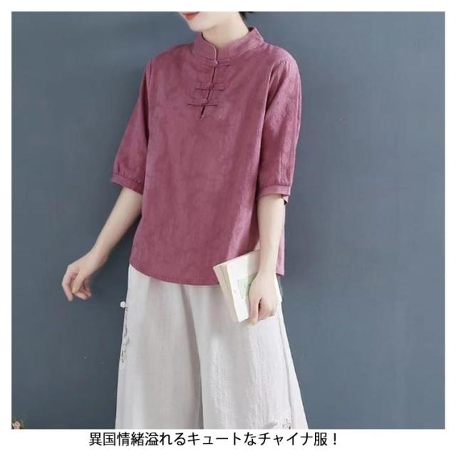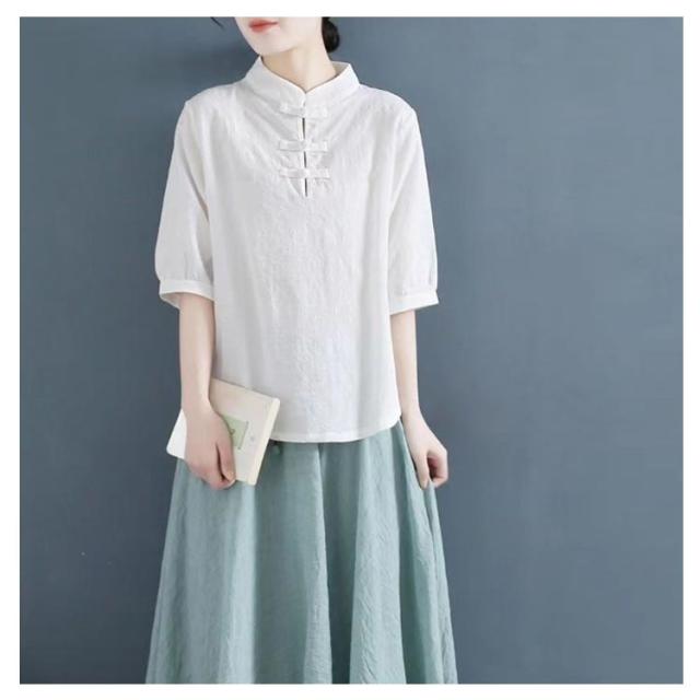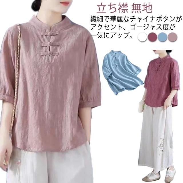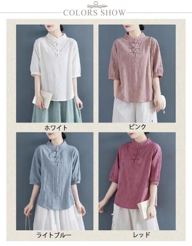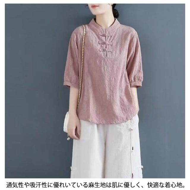 チャイナ風 麻 リネン チャイナボタン レディース 半袖ブラウス 中国風 5分袖 綿 リネンブラウス 春夏 トップス 立ち襟 無地 リネン混 ブラウス 中華 リネンブラウス Tシャツ エレガント