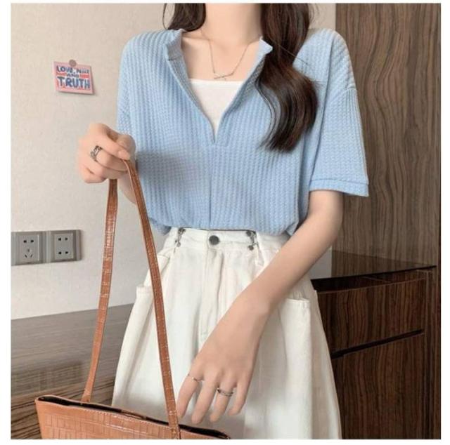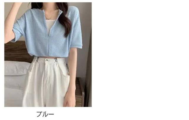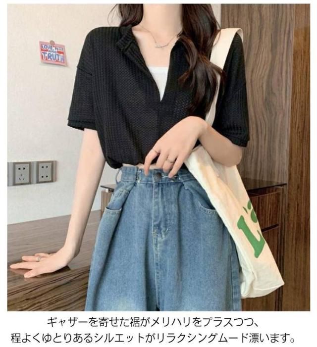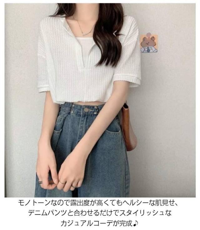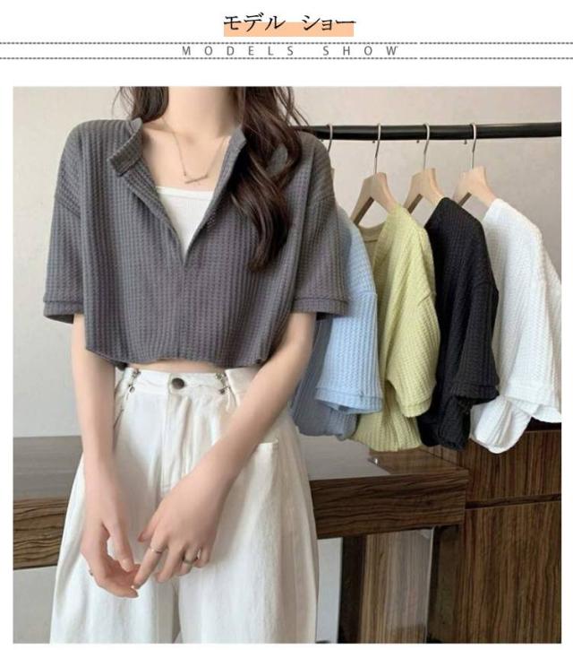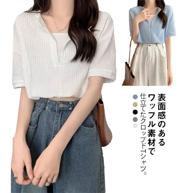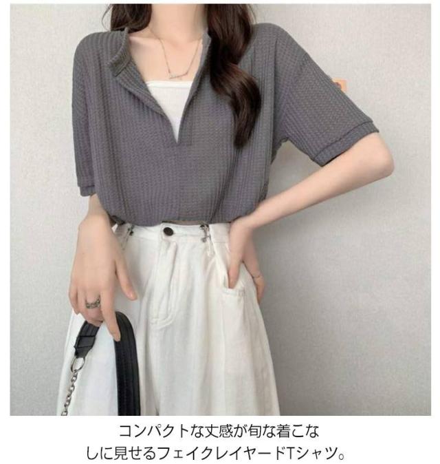 レディース 半袖Tシャツ 半袖 カットソー ショート丈 ワッフル クロップドシャツ クロップドTシャツ Tシャツ クロップド丈 Vネック 重ね着風 グリーン へそ出し フェイクレイヤード トップス 夏 20代 30代 40代 春 グレー ホワイト ブラック