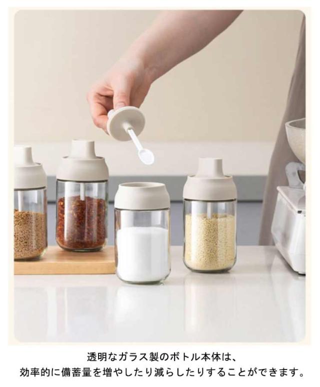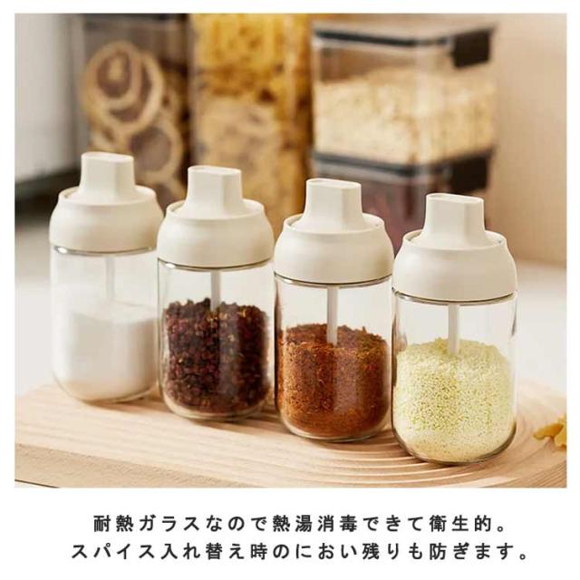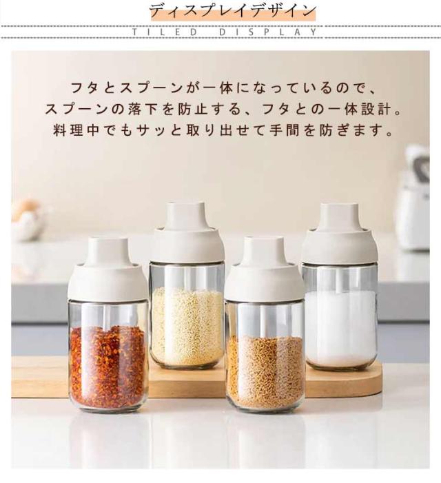 調味料ポット パイス入れ スプーン付き 4個セット 塩入れ 砂糖入れ 調味料入れ 湿気防止 耐熱ガラス 高気密性 調味料缶 調味料入れ 調味料ケース スパイスボトル 香辛料瓶 塩や砂糖など入れ