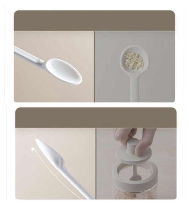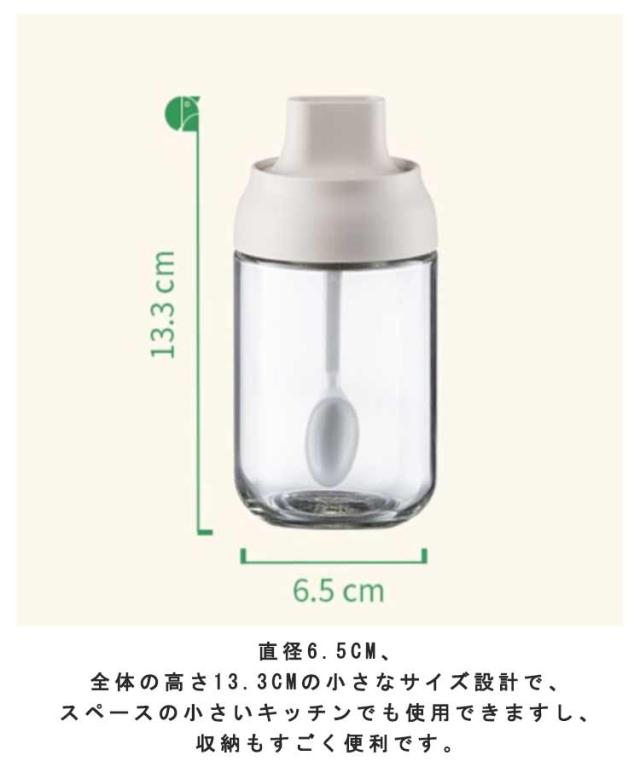 | フタとスプーンが一体になっているので、スプーンの落下を防止する、フタとの一体設計。料理中でもサッと取り出せて手間を防ぎます。 フタはゴムパッキン付き。密閉性と防湿性も◎。衛生面も安心です。 耐熱ガラスなので熱湯消毒できて衛生的。スパイス入れ替え時のにおい残りも防ぎます。 直径6.5cm、全体の高さ13.3cmの小さなサイズ設計で、スペースの小さいキッチンでも使用できますし、収納もすごく便利です。 透明なガラス製のボトル本体は、効率的に備蓄量を増やしたり減らしたりすることができます。 | |