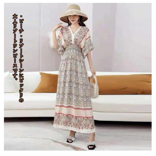 リゾート Vネック 総柄 エキゾチック 夏 フリーサイズ マキシ丈 海 ロング 花柄 ウェストゴム 柔らかい 半袖 ロング丈 個性的 きれいめ おしゃれ アジアン エスニック ワンピース 沖縄 海外旅行 ビーチ