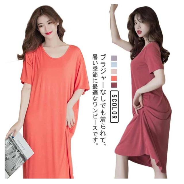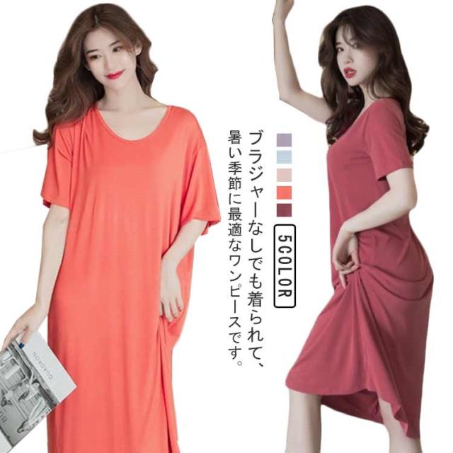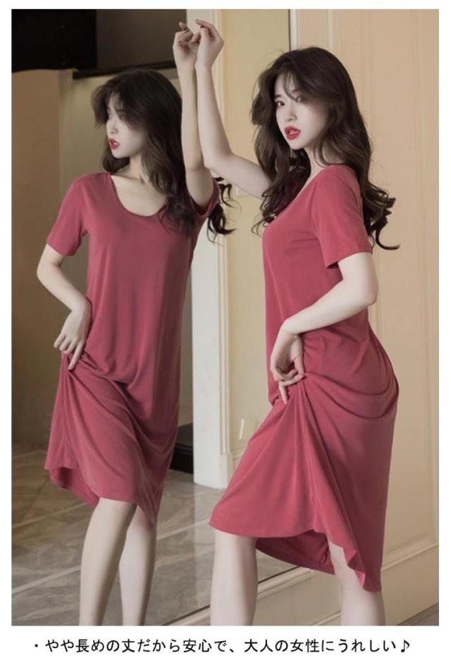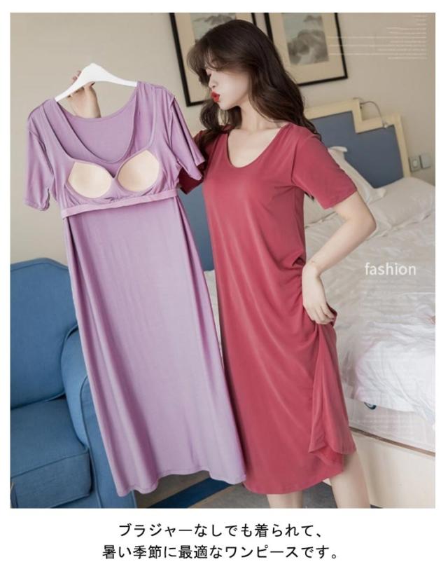 ルームウェア 半袖 カップ付きワンピース ワンピース ロングTシャツ 部屋着 ラウンドネック カップ付きワンピース ロング丈 リラックス ゆったり かわいい シンプル