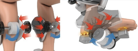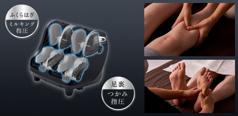 ふくらはぎは「もみ板」と「回転ローラー」でしぼるようにもみほぐし、足先は「もみ板」と「足裏ローラー」でつかんでもみほぐします。