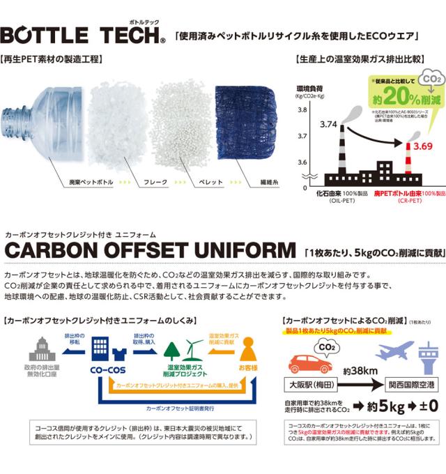 汗ジミ防止(汗取りパッド付き)、ボタン付胸ポケット、左袖マルチポケット、消臭テープ付、転写プリント(ボトルテック、カーボンオフセット、エコマーク)