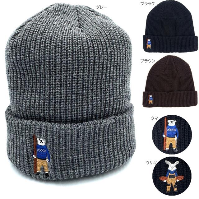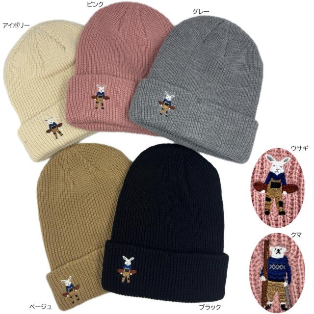 ウサギ、クマのワンポイントの刺繍がアクセントのニットキャップです。