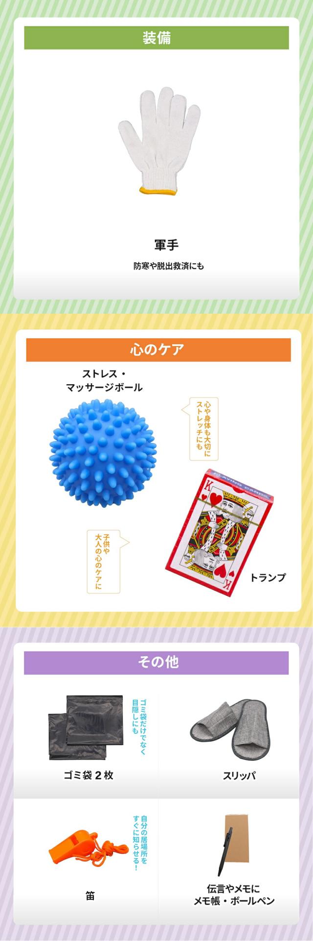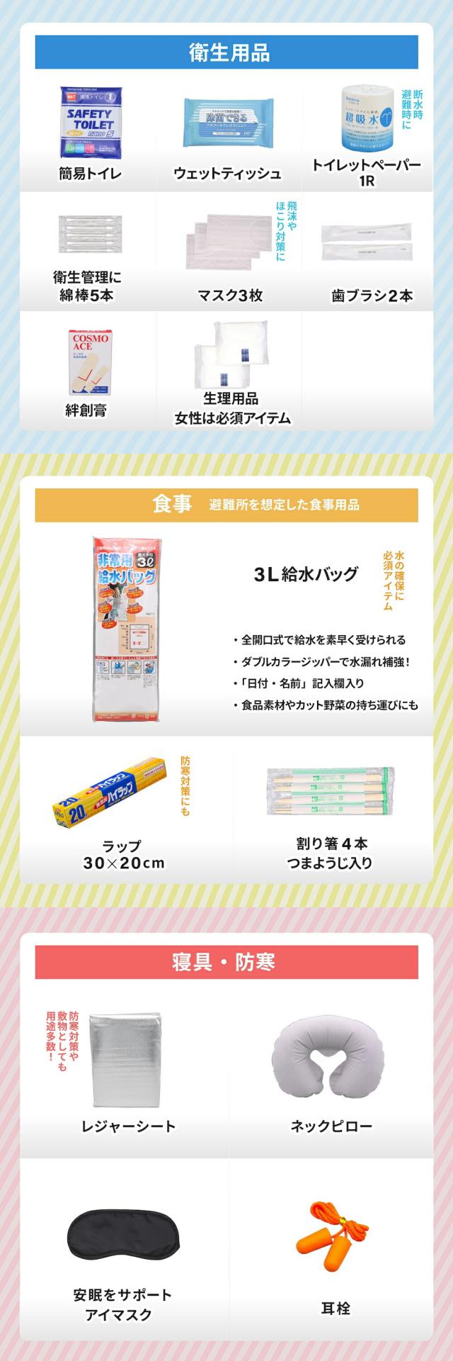 3Lタンク・ラップ・割りばし4本・レジャーシート・耳栓・アイマスク・ネックピロー・軍手・ミニスライドランタン・綿棒5本・歯ブラシ2本・トイレットペーパー1R・ウェットティッシュ10枚入・生理用品2個・簡易トイレ1個・マスク3枚・絆創膏・笛・スリッパ・ゴミ袋2枚・メモ帳・ボールペン・ストレスマッサージボール・トランプ
