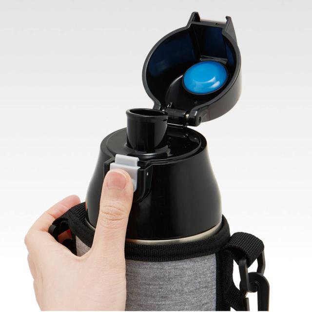 ワンタッチで開閉が出来る直飲みタイプの水筒です。たっぷり飲める容量990mlです。保冷専用で真空二層構造により、保冷効果が長持ちします。ボトルカバーには肩から掛けられるショルダーベルト付きで持ち運びに便利です。ファスナー部分には引っ掛かりを防ぐファスナーカバーが付いています。