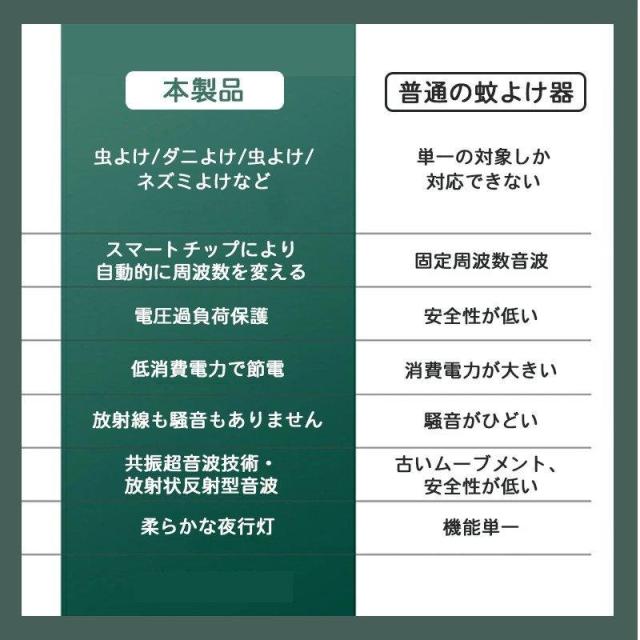 超音波式害虫駆除機はハイテクを採用した電子製品で、超音波を生じます。害虫の内分泌システムと生理学的な機能を乱すことができ、これによって昆虫駆除の効果を果たします。超音波は人体と他の動物に無害なので、とても安全です。