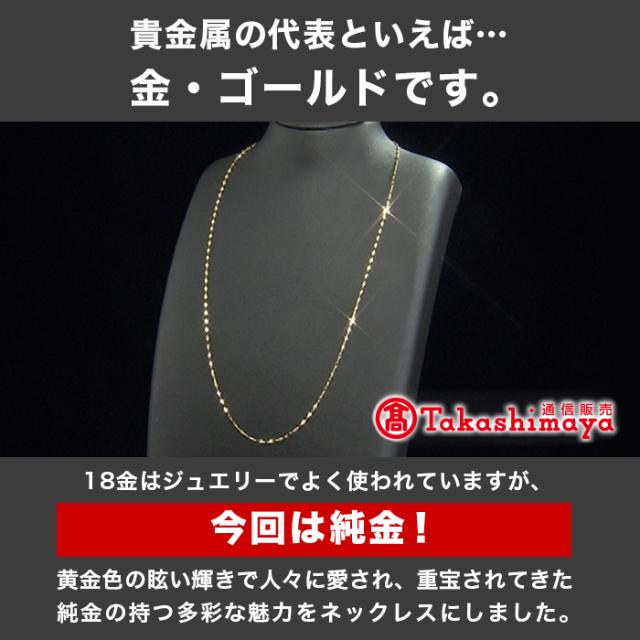 18金はジュエリーでよく使われていますが、今回は純金!黄金色の眩い輝きで人々に愛され、重宝されてきた純金の持つ多彩な魅力をネックレスにしました。