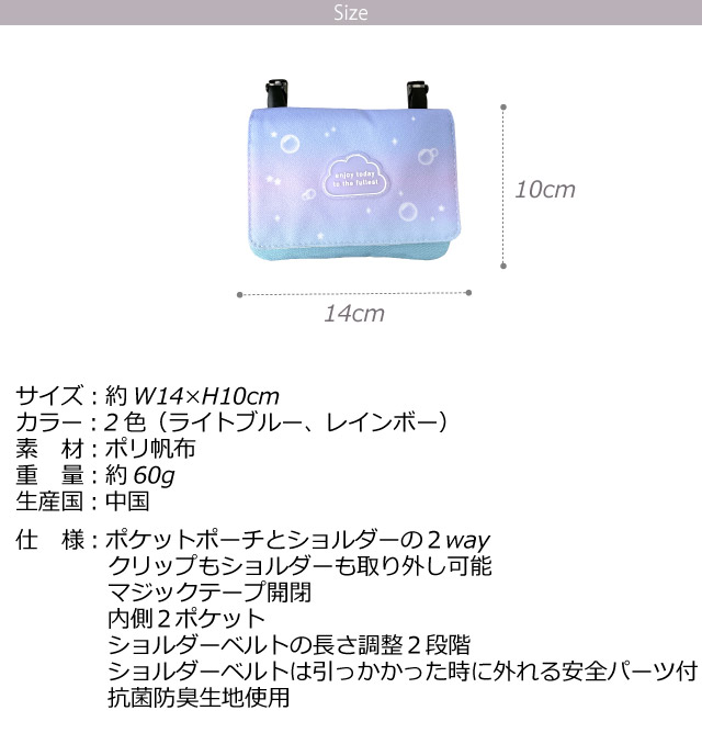 ![]() ![]() ![]() ![]() ![]() ![]() ・Pirica nonno ピリカノンノ クラウドラバー 雲のロゴとグラデーションが可愛い移動ポケット。 ポケットのないお洋服でもクリップで簡単に取り付けられるポケットです。 抗菌防臭機能付きでティッシュやハンカチ・リップや絆創膏・マスクなどいつも持っておきたい小物の収納に便利 2段階調節可能なショルダー紐付きでミニショルダーとしても使えます。 クリップもショルダー紐も取り外せるのでお手入れも簡単 ポーチとしても使えます。 幼稚園・小学校の入園、入学用やプレゼントにもおすすめです。